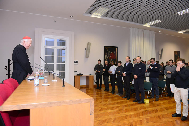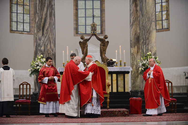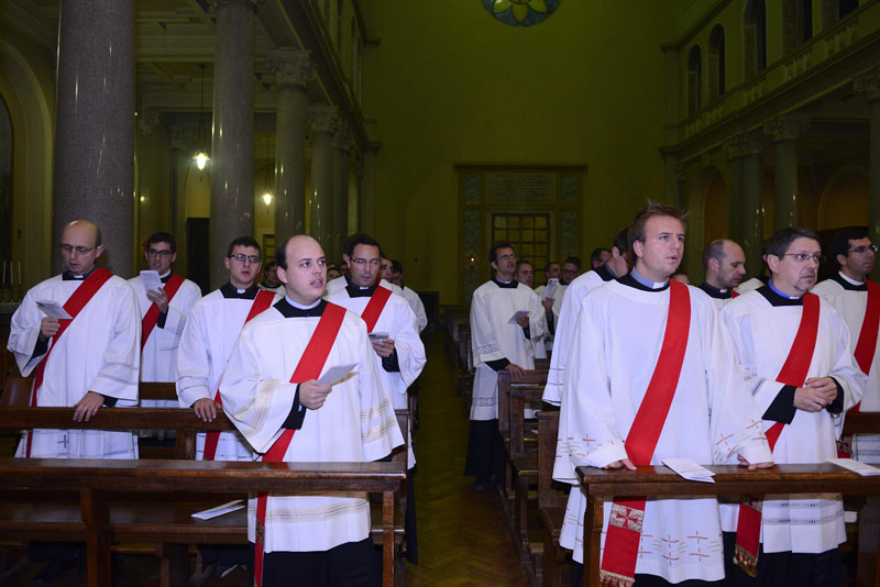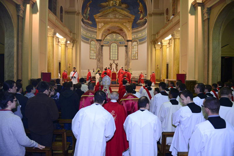 Tra i portici illuminati, ma sotto un cielo scuro di pioggia, autunnale e lombardo, con il freddo fattosi improvvisamente pungente, si respira invece il caloroso “esserci” di una comunità viva, come noterà poco dopo l’Arcivescovo: si prega, si dice il Breviario, alcuni parlano tra loro della ripresa degli studi, altri apprestano, un poco in ansia, i paramenti per la Celebrazione… D’altra parte c’è il Cardinale e oltre trenta concelebranti, tra cui il rettore monsignor Maffi che, all’inizio della Messa, dice: «Siamo felici, Eminenza, della sua presenza e per la riflessione molto intensa che ci ha proposto. Celebriamo insieme questa Eucaristia per ringraziare della chiamata del Signore e per i doni che ci offre ogni giorno. Preghiamo perché la nostra sia una testimonianza reciproca di unione reale e docile».