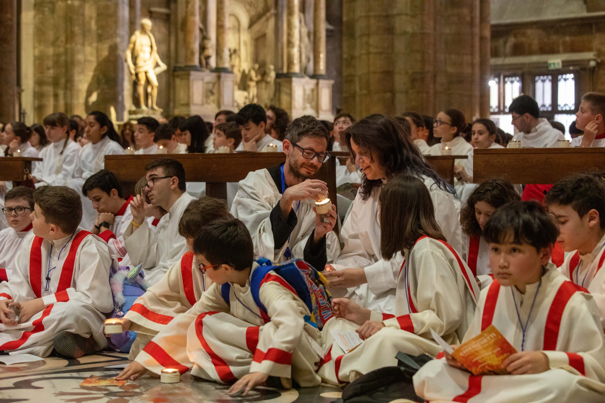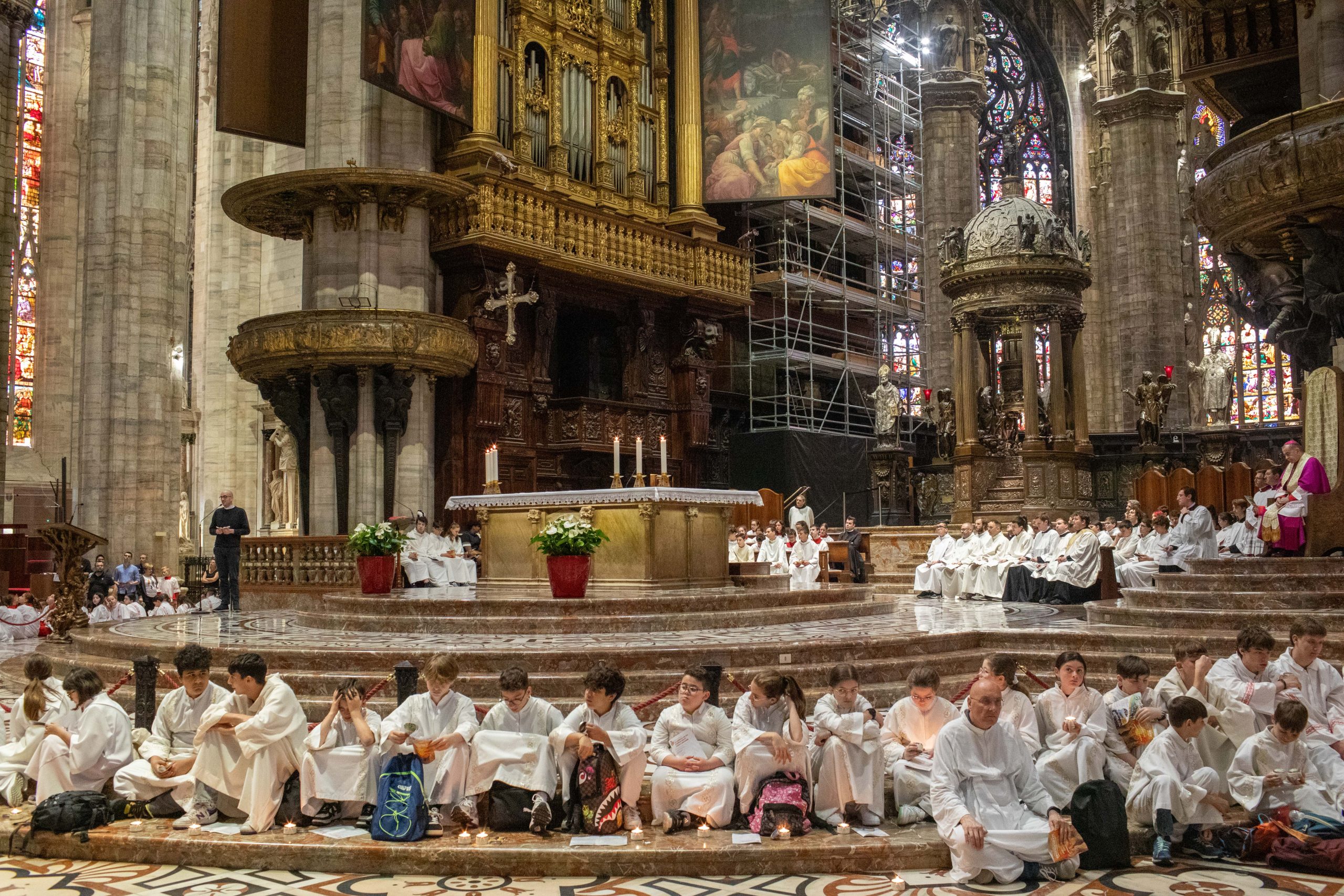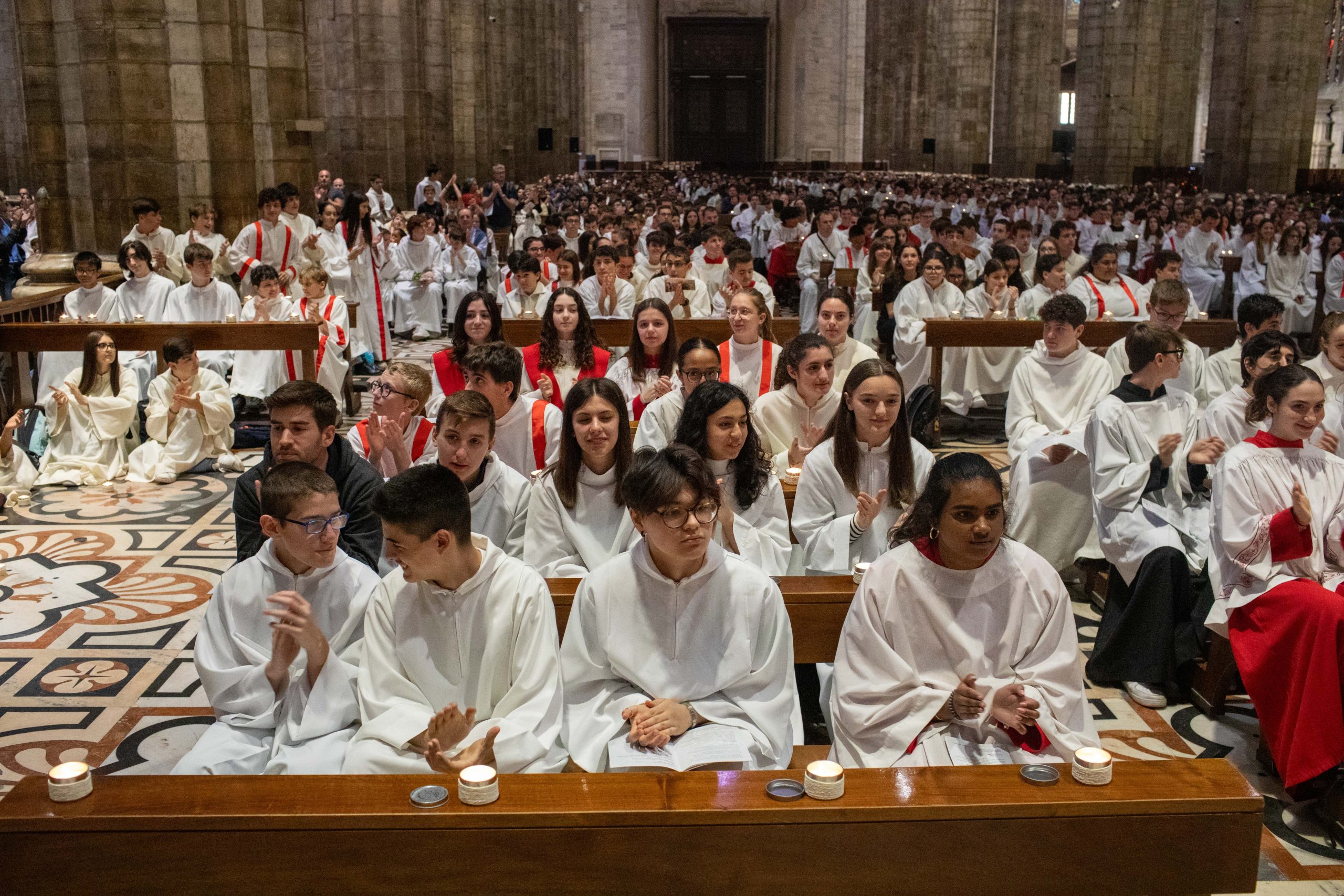 Entrano alla spicciolata, con le loro vesti bianche e rosse, o con la semplice tunica candida, alcuni – i più piccoli – un poco intimoriti dalla maestosità del Duomo inondato di luce, altri – i più grandicelli – con gli immancabili smartphone in una mano e il libretto per seguire la celebrazione nell’altra. Tutti, comunque, richiamati dai loro doni, dagli educatori, da genitori e catechiste che tentano di mantenere l’ordine. Ma anche di cercare un posto dove sedersi, perché la Cattedrale si riempie in pochi attimi.