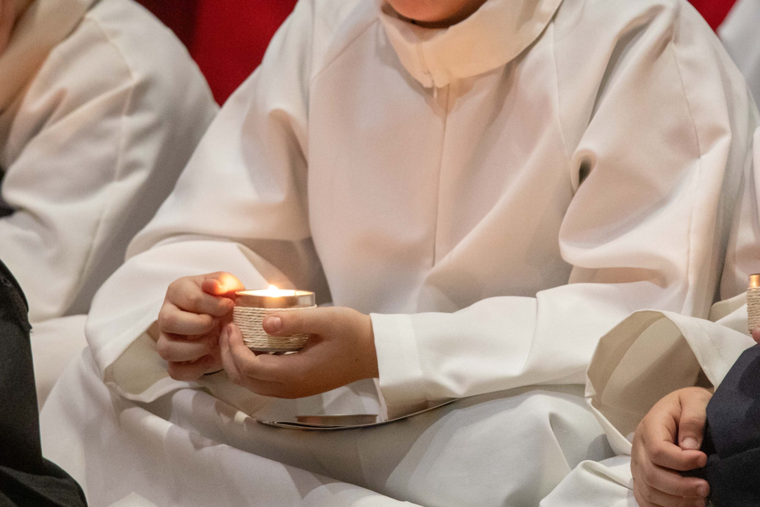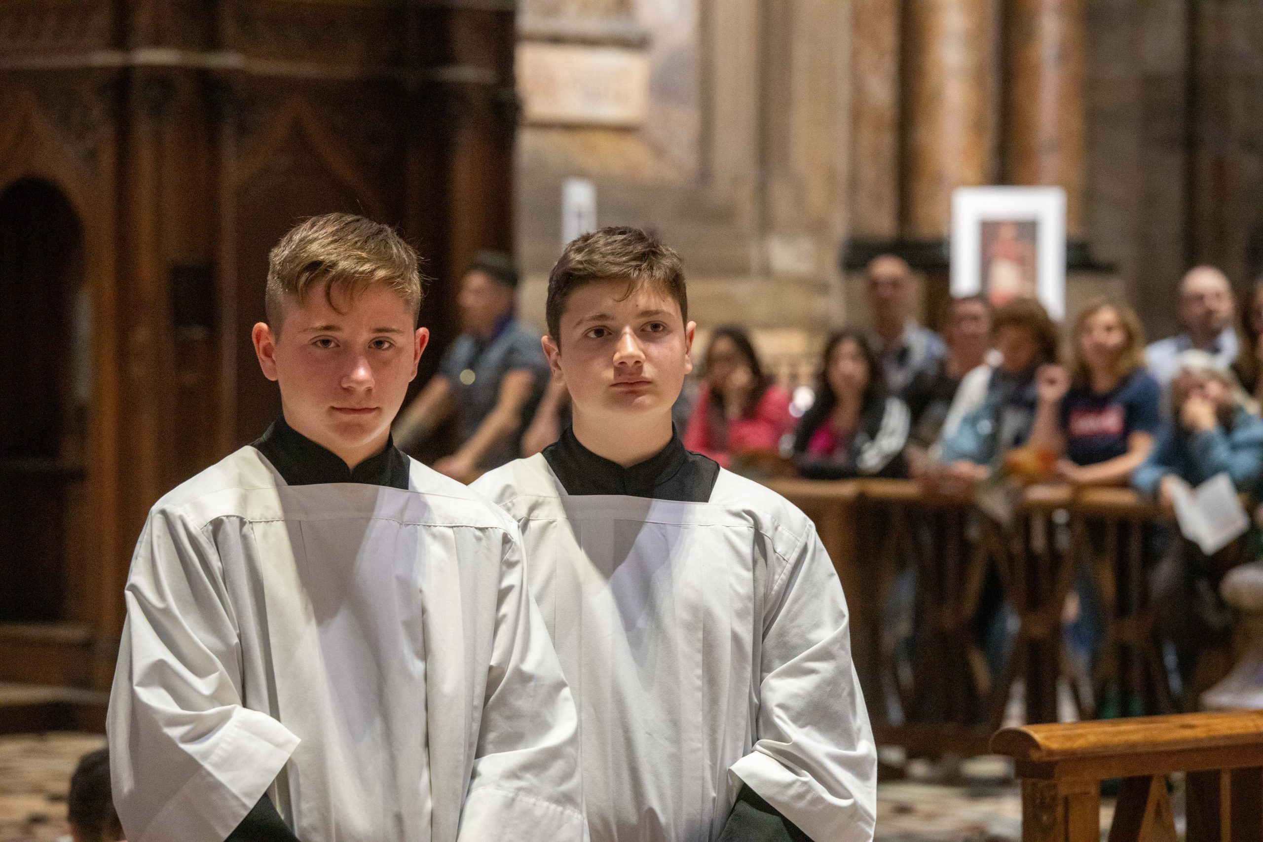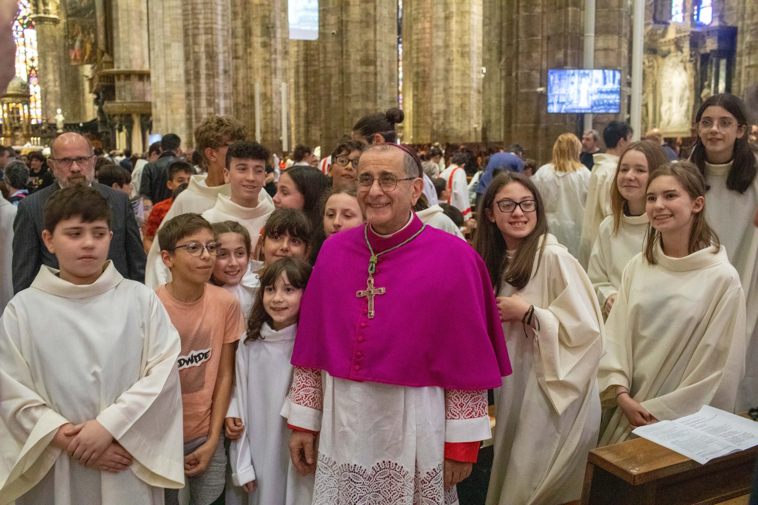 Entrano alla spicciolata, con le loro vesti bianche e rosse, o con la semplice tunica candida, alcuni – i più piccoli – un poco intimoriti dalla maestosità del Duomo inondato di luce, altri – i più grandicelli – con gli immancabili smartphone in una mano e il libretto per seguire la celebrazione nell’altra. Tutti, comunque, richiamati dai loro doni, dagli educatori, da genitori e catechiste che tentano di mantenere l’ordine. Ma anche di cercare un posto dove sedersi, perché la Cattedrale si riempie in pochi attimi.