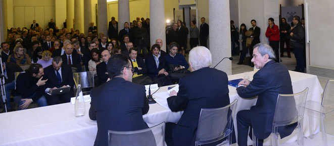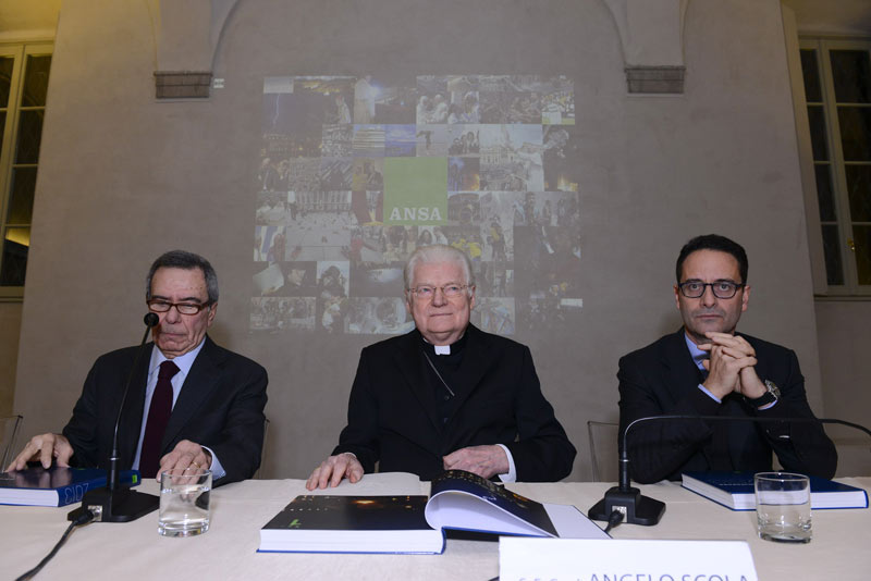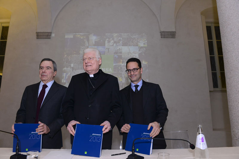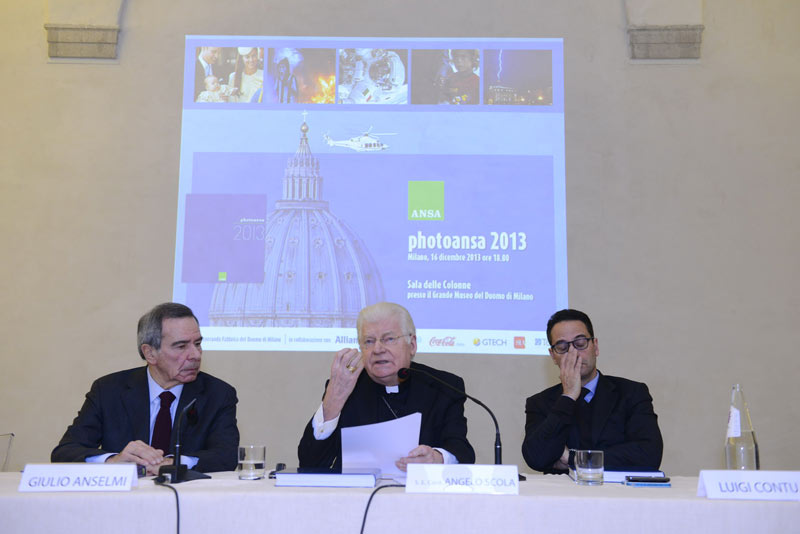 Foto che apre non solo il bel saggio di oltre 380 pagine, ma l’intera prima sezione, dedicata a “Due Papi in Vaticano”. Forse anche per questo la presentazione milanese di PhotoAnsa 2013 – dopo quella romana alla presenza del presidente del Consiglio Enrico Letta -, svoltasi al Grande Museo del Duomo con l’intervento centrale affidato al cardinale Angelo Scola, ha avuto il senso di una profonda riflessione sugli eventi di Chiesa vissuti in questi mesi, per non rimanere fermi solo a una emozione superficiale. Pur immediata di fronte a centinaia di immagini, dalla violenza alle donne alla Siria, dalla “Concordia” al Brasile – sospeso tra i trionfi calcistici del Mondiale e la protesta di piazza – fino alle croci di Lampedusa fatte col legno dei barconi naufragati.