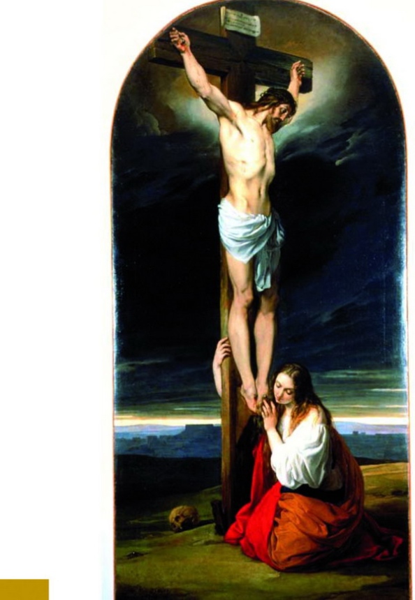 Tutto corre lungo l’alto e massiccio legno della croce: appeso ad essa, Cristo è bello nella perfezione di un corpo che la luce scolpisce, segnato da una sofferenza reale, ma portata con estrema dignità e compostezza. La bruttezza della morte non gli appartiene: solo il teschio ai piedi del patibolo, mentre identifica il Golgota, ne ricorda l’aggressività devastante, ma nello stesso tempo, abbandonato a se stesso, ne preannuncia l’imminente sconfitta.