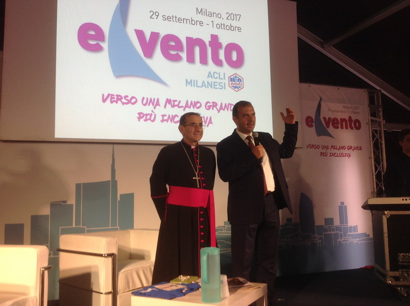 È questo ciò che l’Arcivescovo dice agli Aclisti di Milano, Monza e Brianza raccolti sotto la tensiostruttura allestita in piazza Santo Stefano per il loro evento “Verso una Milano Grande più inclusiva” che si conclude, appunto con un saluto di monsignor Delpini, accolto dal presidente provinciale Paolo Petracca.