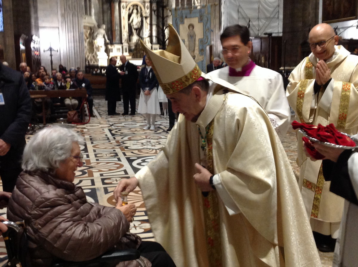 Dopo la comunione portata dall’Arcivescovo ai tanti malati che si trovano nelle prime file, torna il senso di quella che lui stesso definisce «un’immensa gratitudine per la testimonianza che sani e malati danno». Testimonianza che, per qualcuno, dura da 60 anni – dai primi giorni dell’Oftal Milano -, come Giorgio Caprino, Franco Rocca e Giovanna Cerina cui vengono consegnate le pergamene di ricordo e riconoscenza.