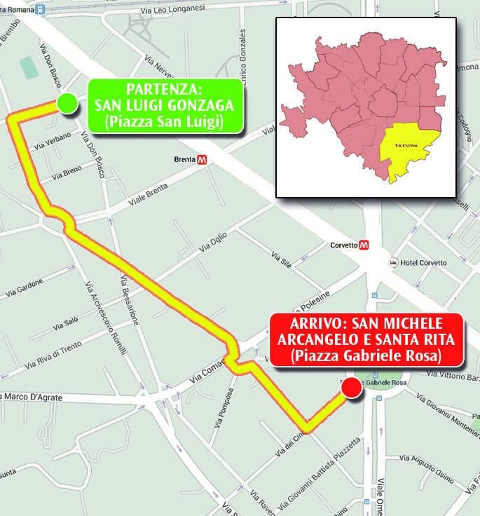 La Messa sarà alle 20 nella chiesa di San Luigi Gonzaga (piazza San Luigi), da cui poi partirà la processione che si concluderà alla chiesa di San Michele Arcangelo e Santa Rita (piazzale G. Rosa).