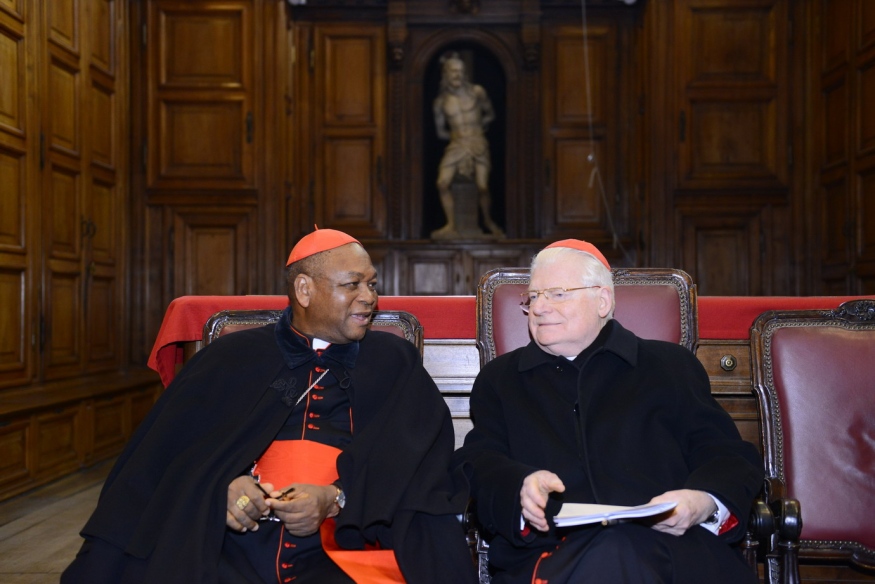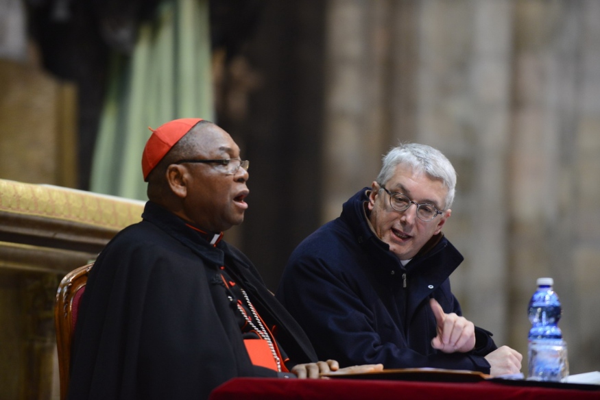 In prima fila, dove siede anche l’Arcivescovo per ascoltare la testimonianza, ci sono tutti i Vescovi ausiliari, i Vicari episcopali di Settore e di Zona. Si prega, anzitutto, per le vittime della tratta che coinvolge oltre 21 milioni di persone nel mondo. Nel suo saluto iniziale il cardinale Scola sottolinea l’importanza dell’ospite: «Siamo molto lieti di accoglierla per condividere il cammino di evangelizzazione e per ascoltare la sua testimonianza col desiderio di imparare. Oggi vogliamo avvicinarci al continente africano, ascoltando lei, Eminenza, che è alla guida di una Chiesa in crescita. Seppure i flussi migratori abbiamo reso più familiare il vostro continente, esso resta tutto da scoprire e ci interessa il cammino di evangelizzazione che state percorrendo. La nostra Chiesa ambrosiana, seguendo l’indicazione del Santo Padre a uscire e a percorrere tutte le vie dell’umano, si confronta con altre etnie e con i cristiani delle nostre terre. Nella prospettiva dell’incontro su cui insiste papa Francesco, siamo sicuri di poter trarre preziose indicazioni per la Chiesa di Ambrogio e Carlo».