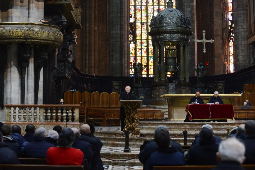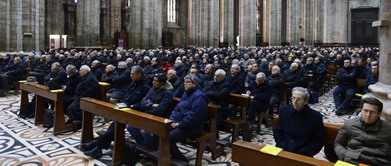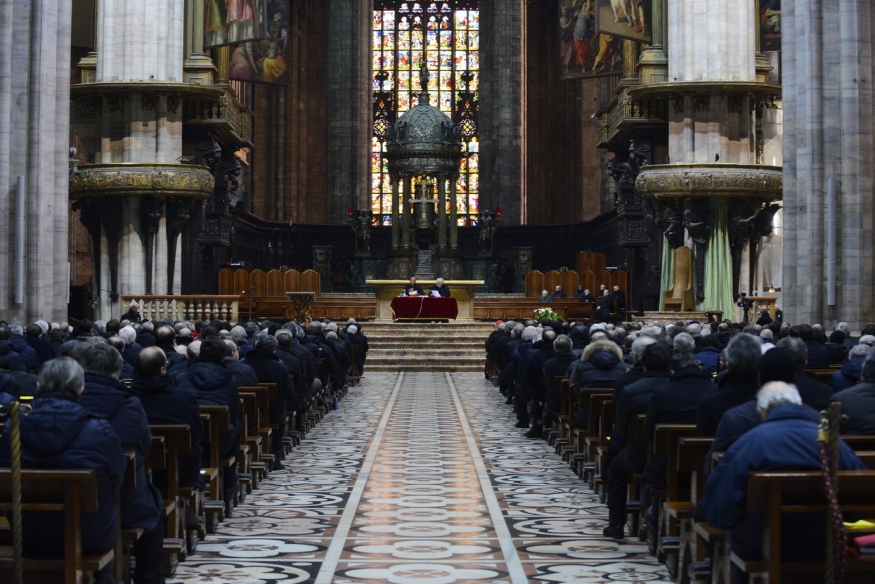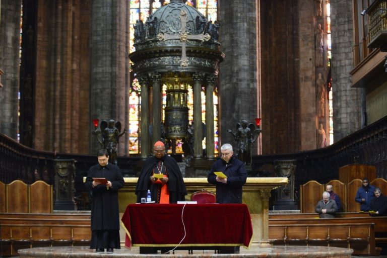 In Duomo, dove ci sono un migliaio di sacerdoti, religiosi, religiose e diaconi permanenti, entra molto atteso il cardinale John Onaiyekan, arcivescovo di Abuja, insieme al cardinale Scola che l’ha invitato, e al vicario episcopale monsignor Bressan.