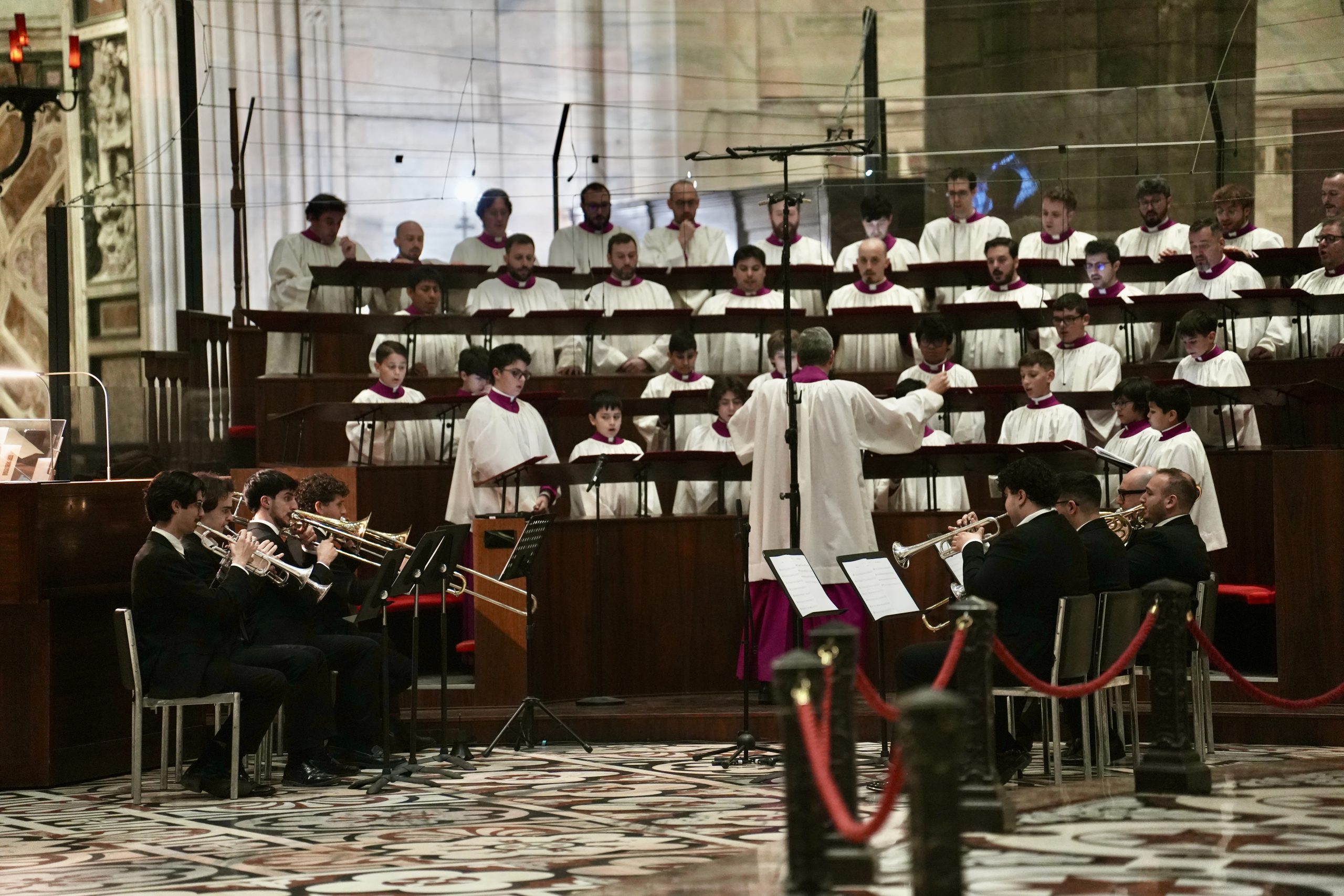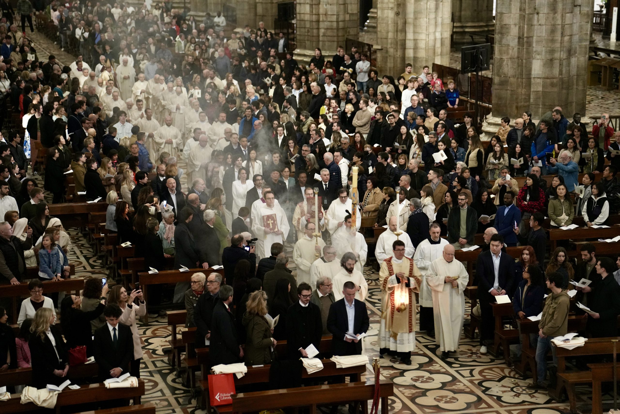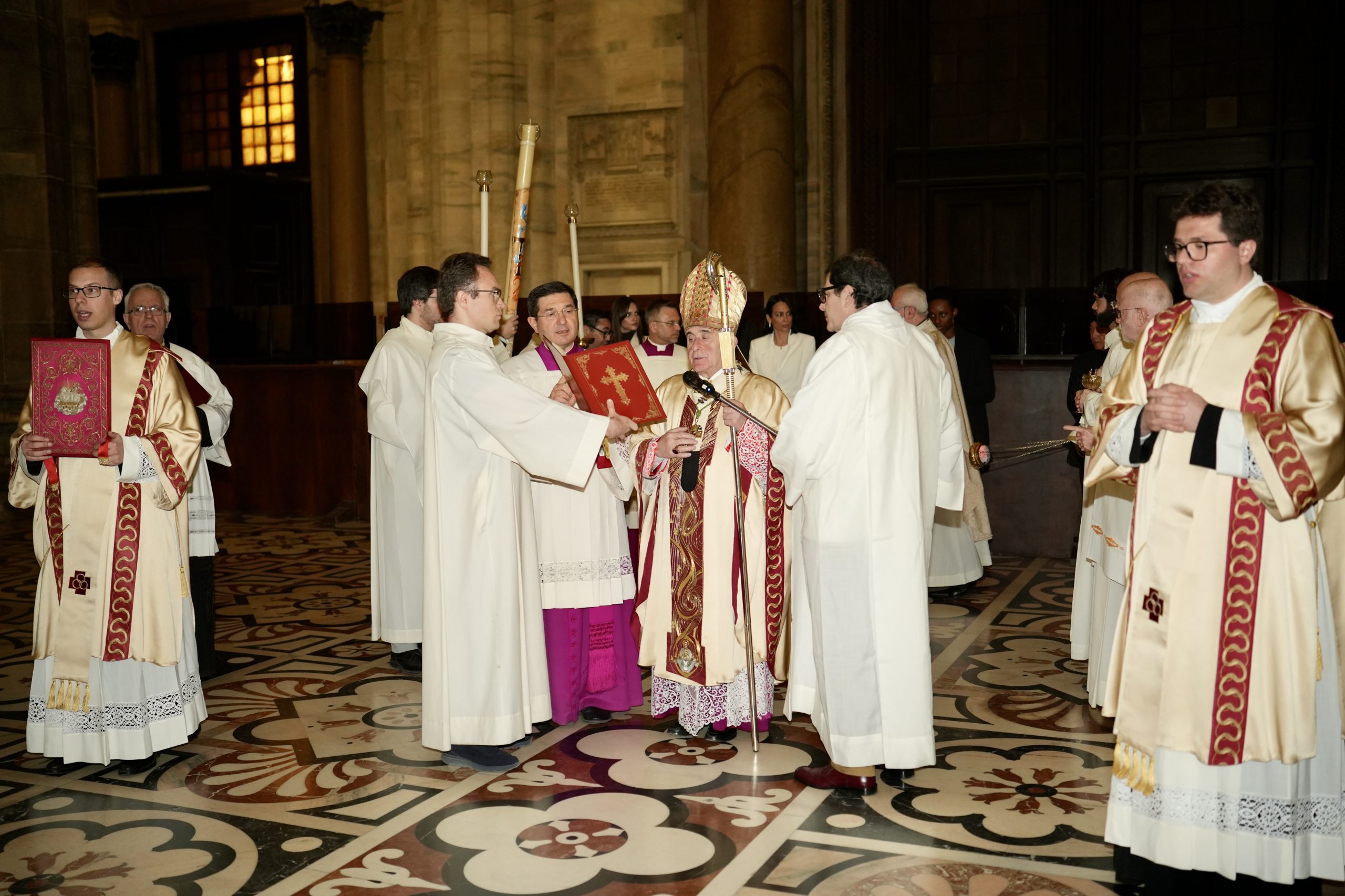 Finalmente è il triplice annuncio della Risurrezione, “Christus Dominus resurrexit” – anch’esso peculiare del Rito ambrosiano e in tutto simile al “Cristòs Anesti” della liturgia bizantina nella Pasqua ortodossa – a essere proclamato, con voce crescente, dal vescovo Mario Delpini ai tre lati dell’altare maggiore. Le campane, in silenzio dalla Celebrazione della Passione del Signore del Venerdì santo, si sciolgono e torna l’atteso canto dell’Alleluia, assente dalla prima domenica di Quaresima, sottolineato dalle sonorità di un ensemble di 8 ottoni che si aggiungono ai canti eseguiti con maestria dalla Cappella musicale del Duomo durante l’intera liturgia.