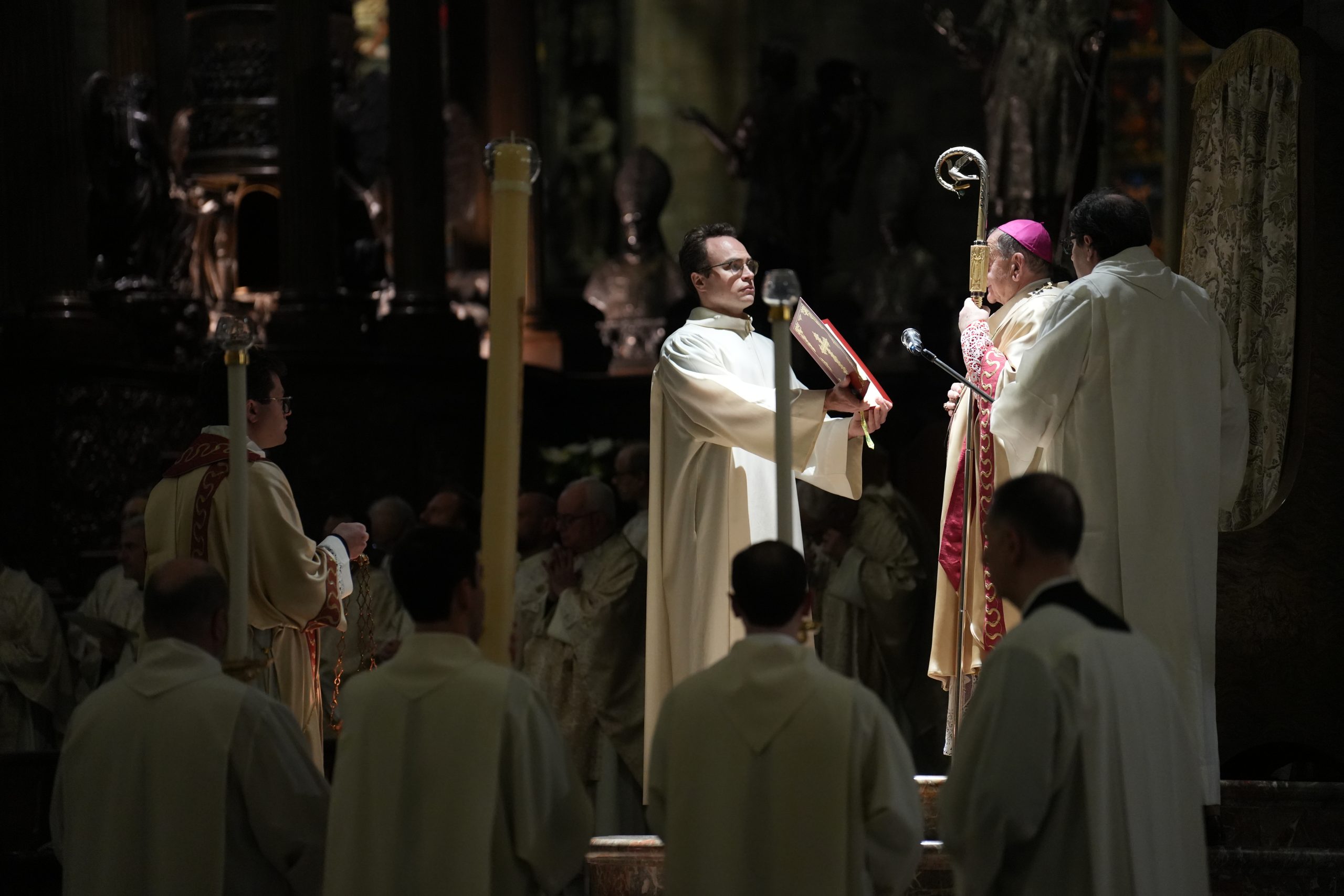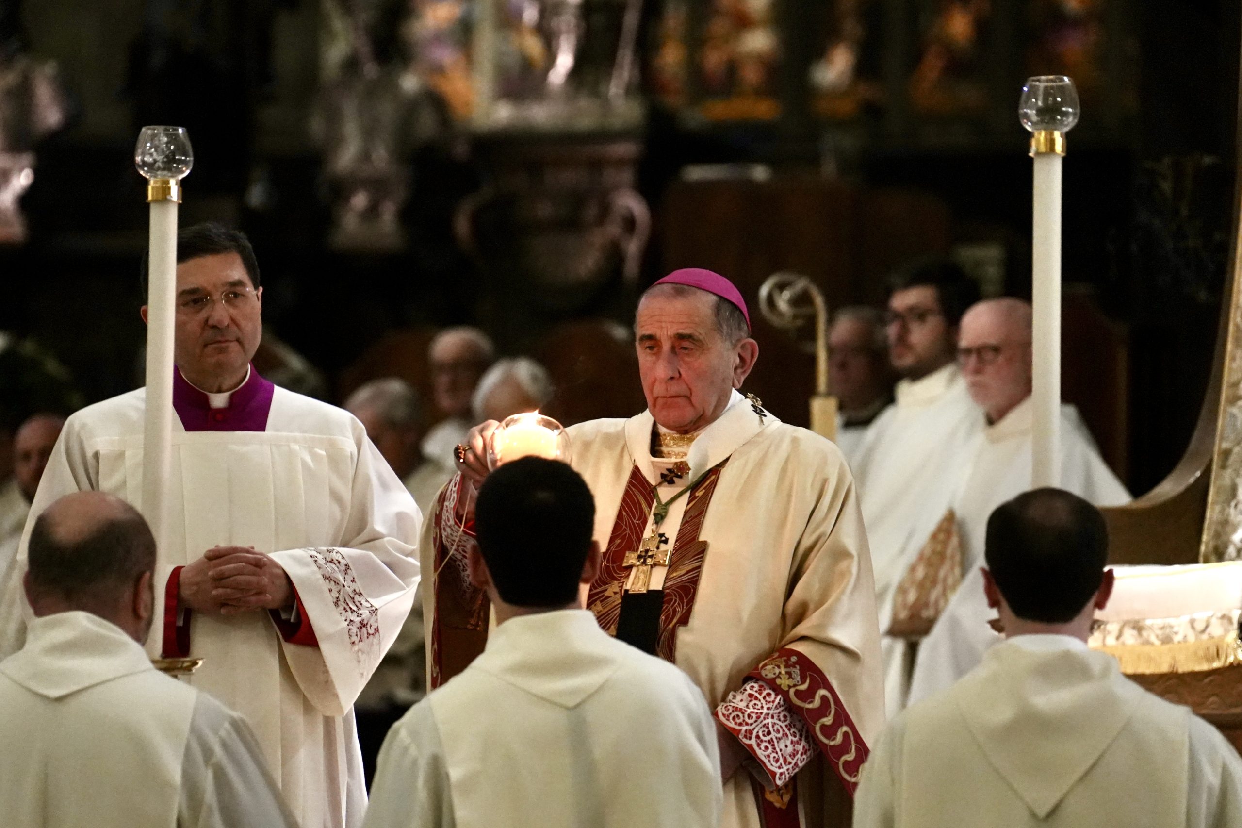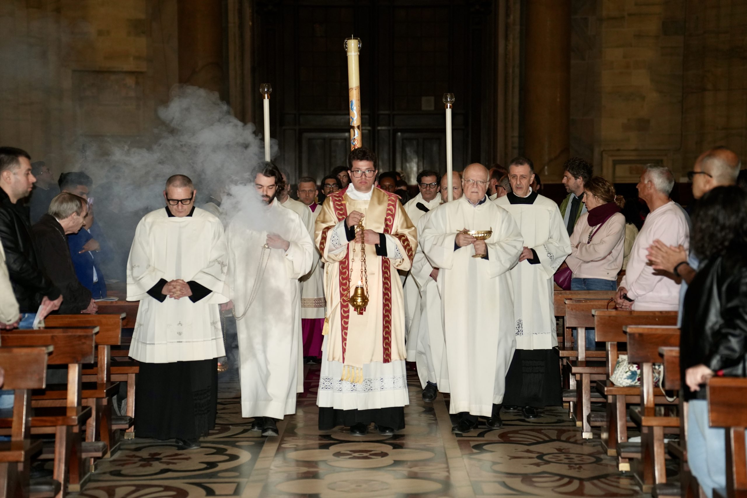 Un segno di speranza – come l’intera Veglia concelebrata da una ventina di sacerdoti, tra cui il Capitolo metropolitano della Cattedrale al completo – esemplificata, all’inizio, dalla benedizione del lume e, poi, dall’accensione del cero pasquale, decorato, come ormai tradizione, dalle Clarisse del monastero di clausura “Santa Chiara”, presenti nel quartiere Gorla di Milano. Ispiratesi, nell’anno che ricorda l’ottavo centenario del transito di san Francesco, ai testi poetici del Cantico delle Creature e del Preconio pasquale tipico ambrosiano, risalente alla fine del V secolo-inizio del VI e che, cantato in latino dal diacono quale sintesi poetica dell’intera storia della salvezza, si interrompe due volte per l’accensione del cero stesso, dei cantari e delle candele dell’altare, mentre in Cattedrale torna a splendere la luce.