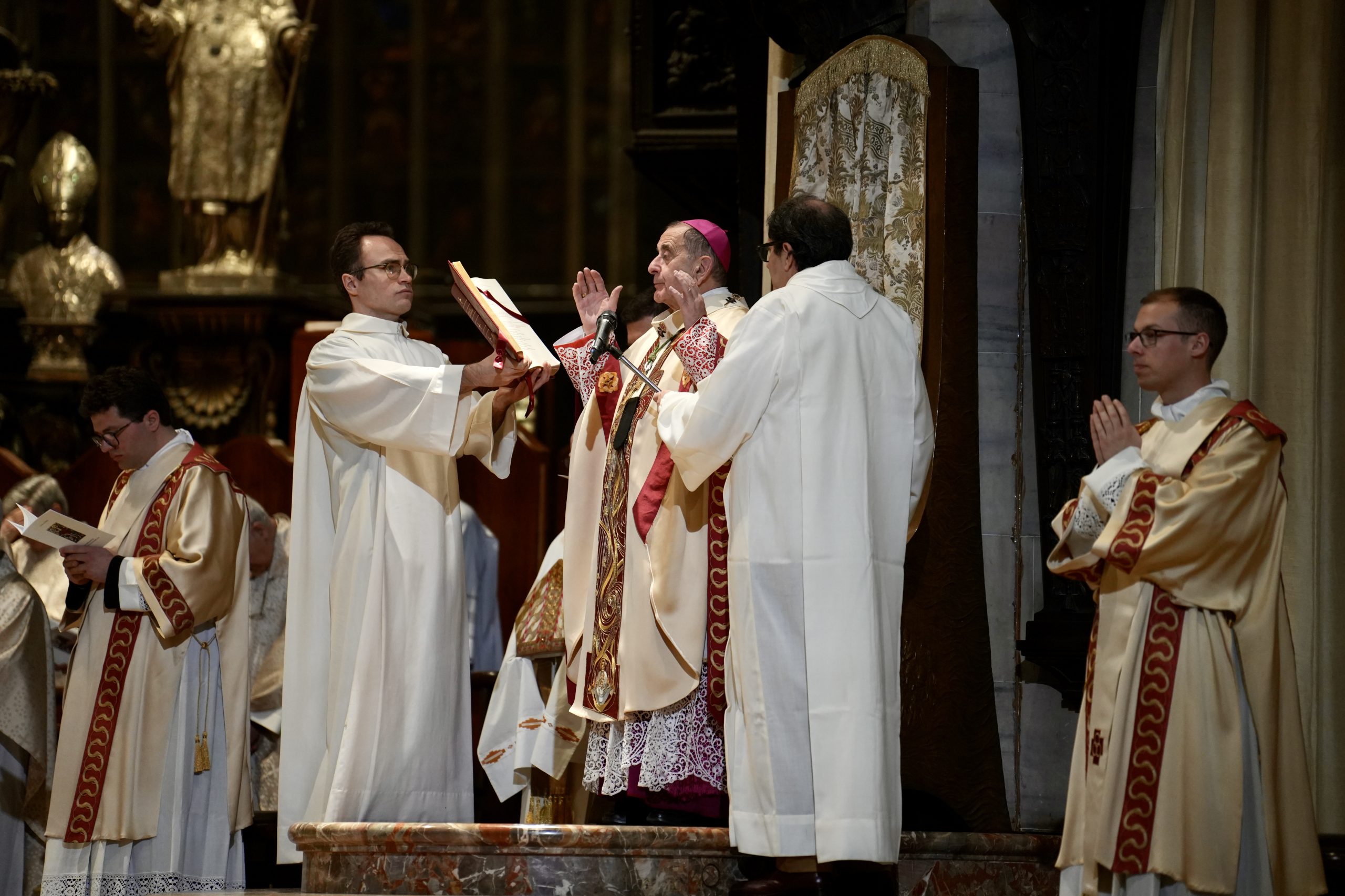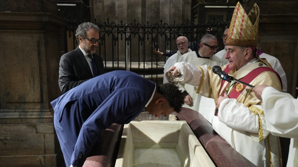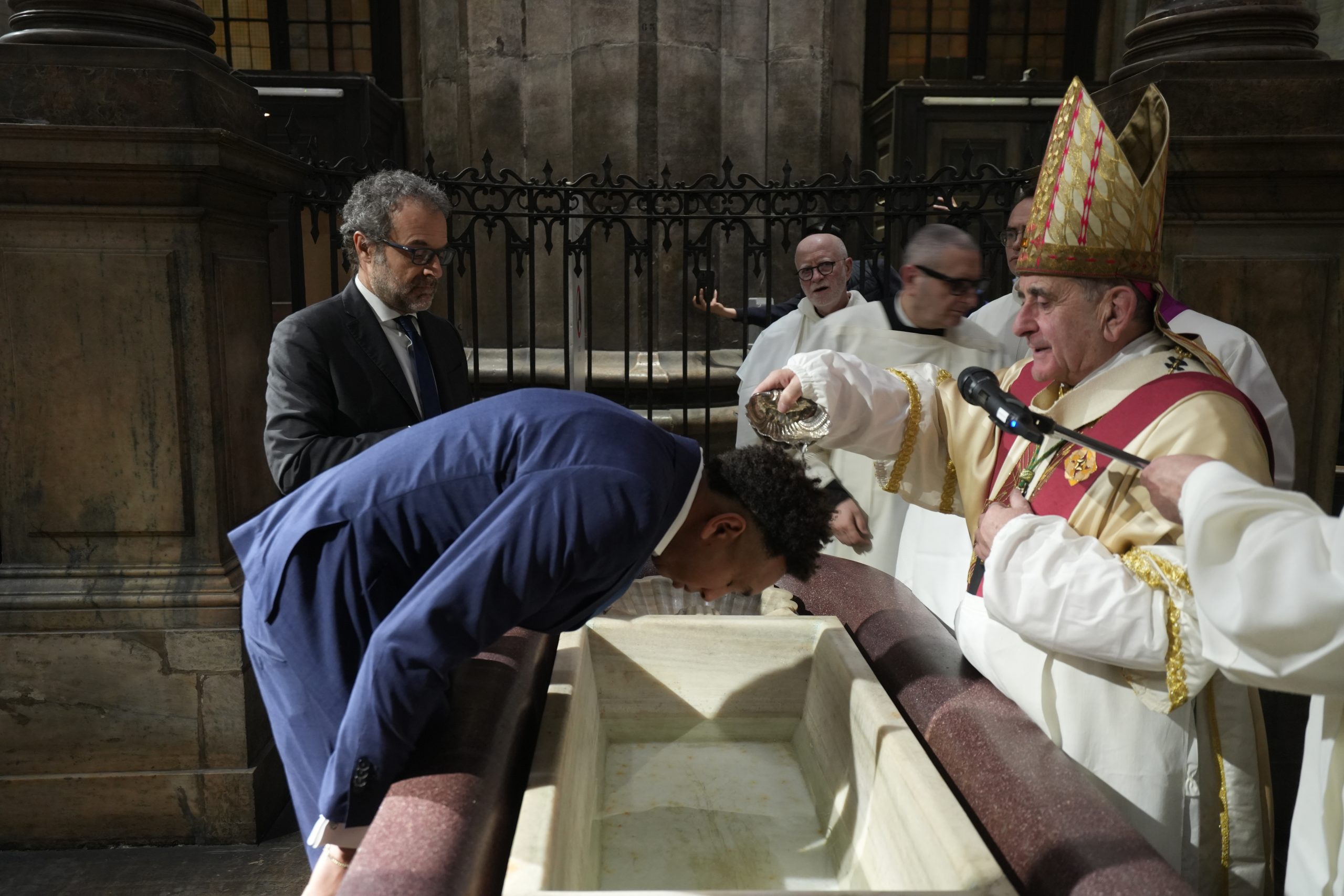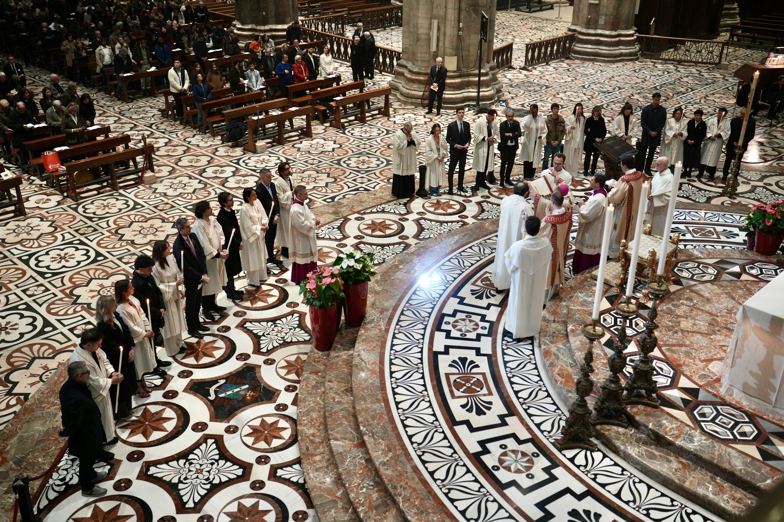 Come, appunto, fanno e faranno i catecumeni – due provenienti dalla Cappellania di lingua cinese, 6 che frequentano l’Università Cattolica del Sacro Cuore, uno l’“Humanitas University” e gli altri espressione di parrocchie del centro di Milano -, che, con l’Arcivescovo, i padrini e le madrine, i concelebranti, poco dopo emozionatissimi, si recano presso il fonte battesimale di epoca borromaica vicino all’ingresso del Duomo.