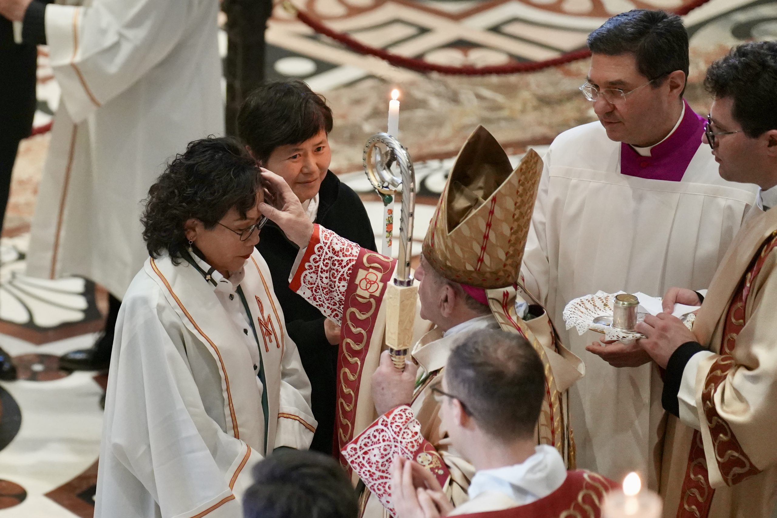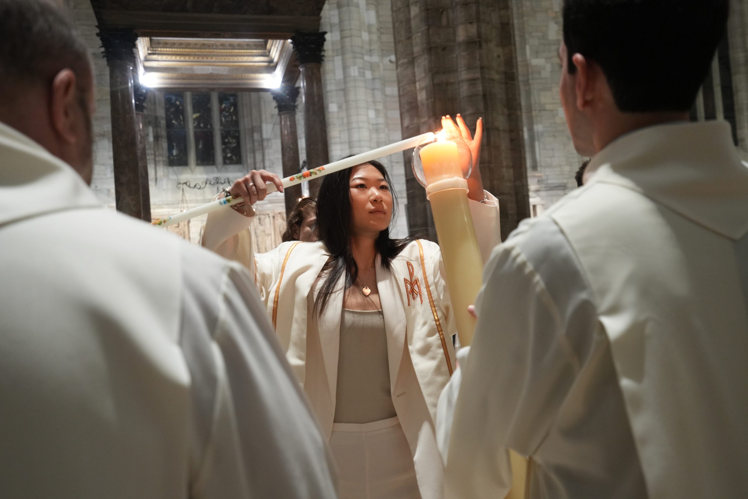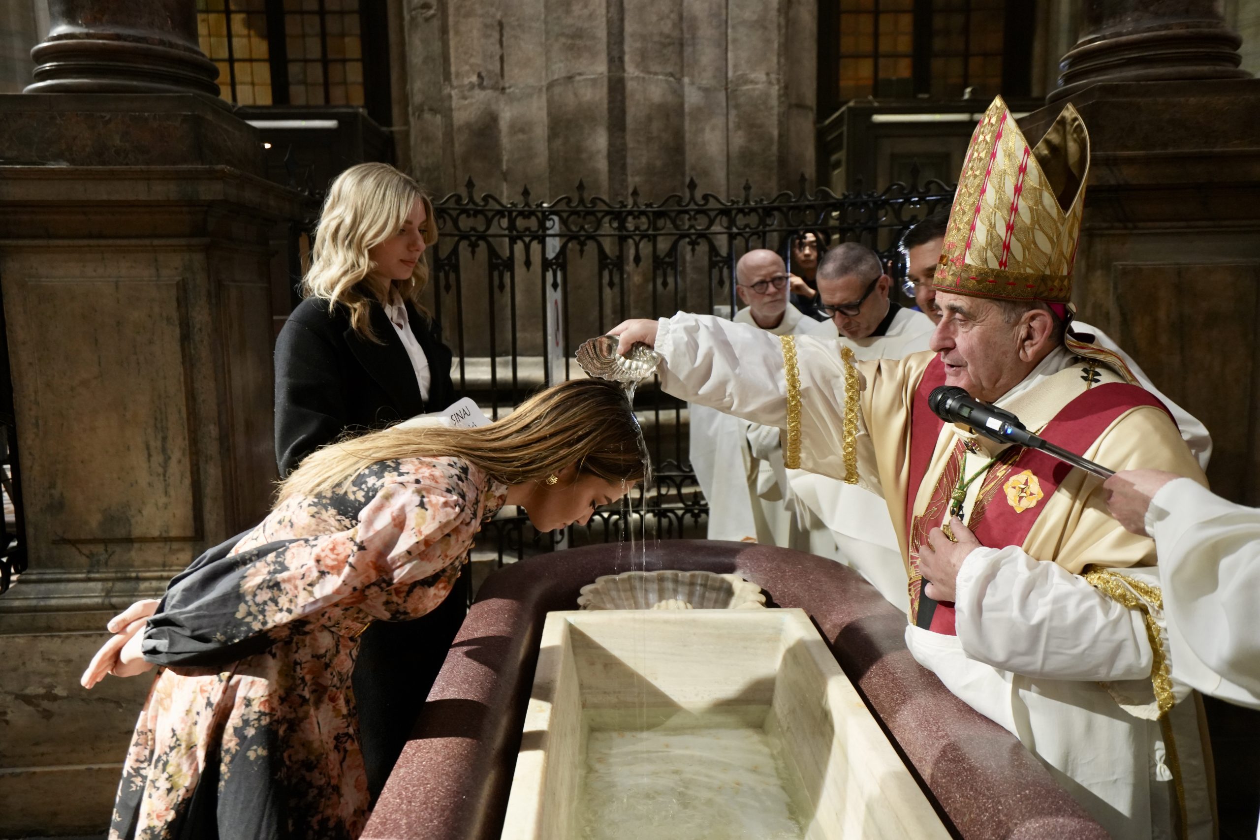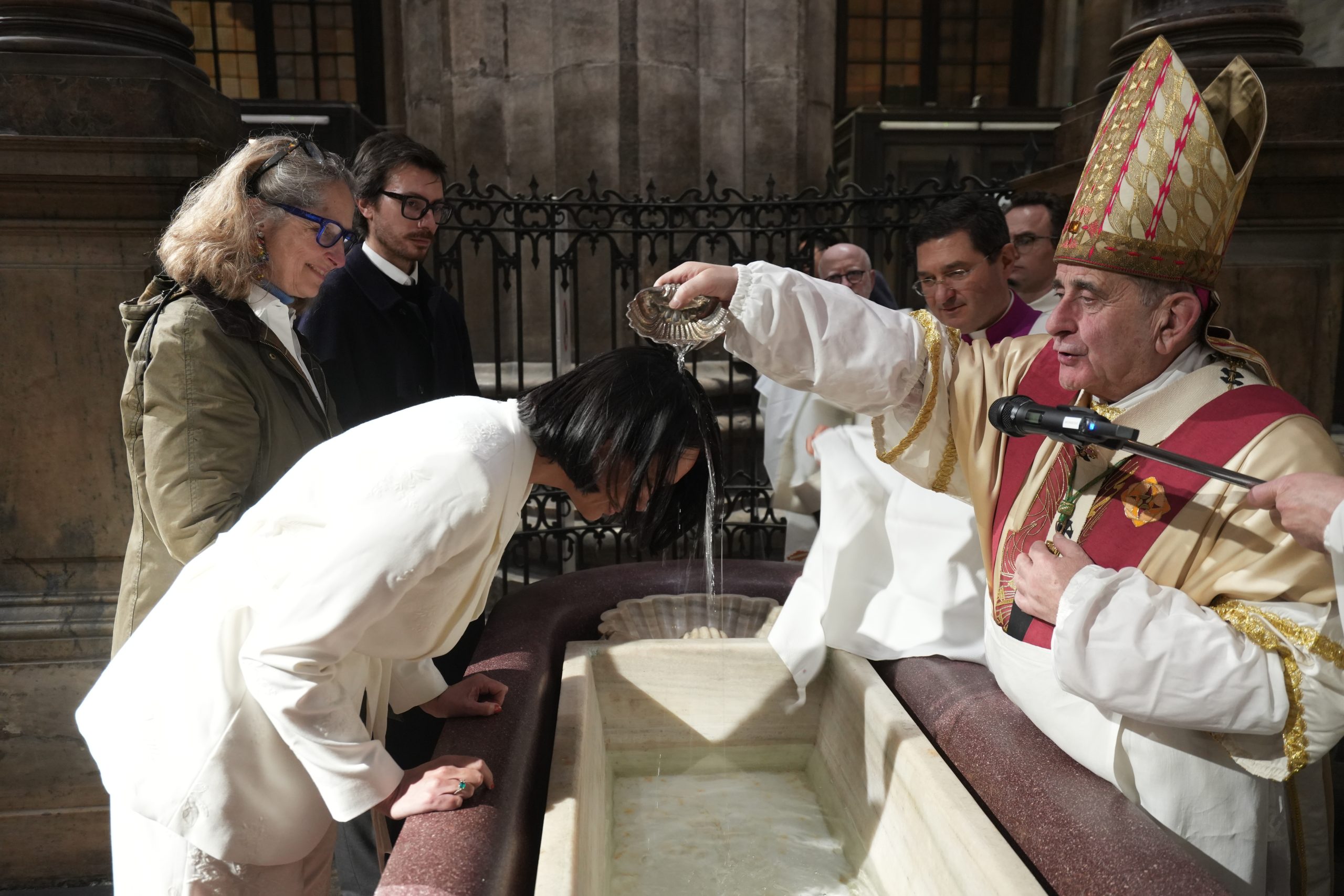 Laddove ricevono il battesimo, indossano la veste bianca e accendono una candela al cero pasquale. Poi, il ritorno in processione percorrendo la navata centrale, mentre il vescovo Delpini asperge l’assemblea tutta con l’acqua battesimale, fino ad arrivare ai piedi dell’altare maggiore dove vengono conferiti agli ormai neofiti il sacramento della Confermazione e, nella liturgia eucaristica, la comunione.