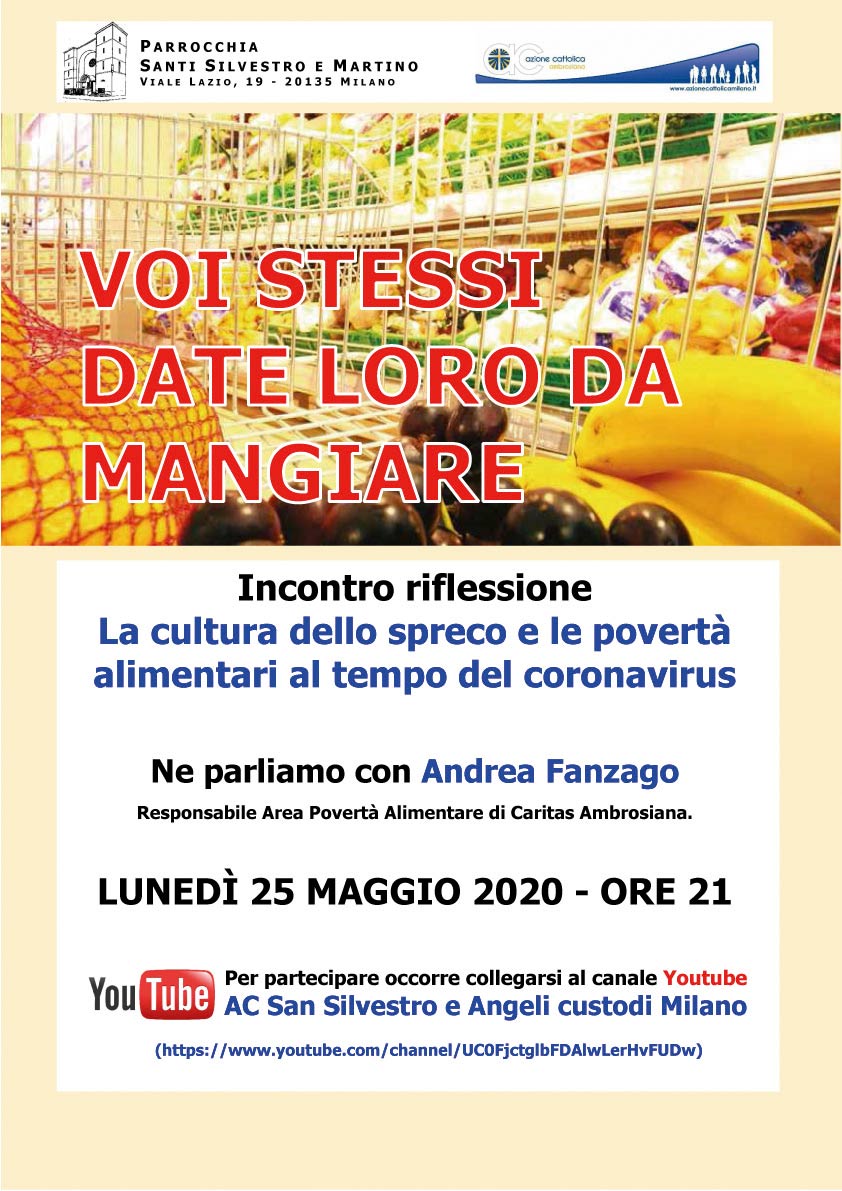 Proprio su questa linea d’onda si inserisce l’incontro online fissato in calendario per lunedì 25 maggio alle 21, sul tema «Voi stessi date loro da mangiare. La cultura dello spreco e le povertà alimentari al tempo del coronavirus», con Andrea Fanzago, responsabile dell’area Povertà alimentari della Caritas ambrosiana.