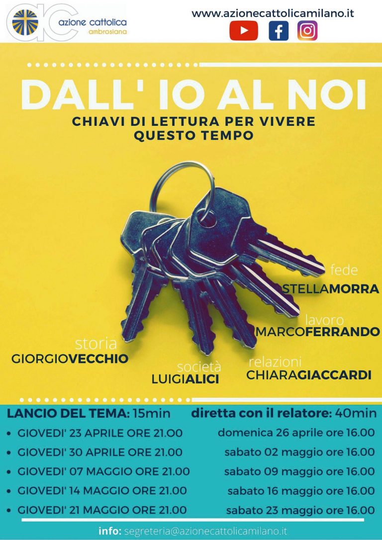 Nelle scorse settimane l’Azione cattolica ambrosiana ha lanciato l’iniziativa «Dall’io al noi: chiavi di lettura in tempo di coronavirus», ossia video realizzati da relatori che offrono diversi spunti di riflessione per vivere questo tempo.