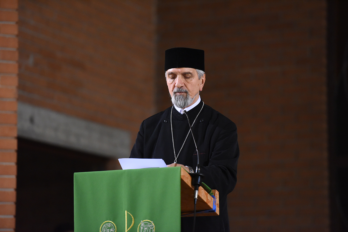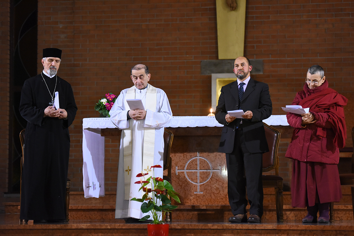 Il decano e arciprete della Chiesa ortodossa romena padre Traian Valdman, dopo la lettura della Lettera agli Efesini, sottolinea: «Gesù è il creatore della pace e della riconciliazione, perché in lui – uomo e Dio – l’uomo incontra Dio. Cristo annuncia la pace a chi è vicino e a chi è lontano. L’amore per gli altri, specie verso chi vuole fare del male, è un investimento di amore e di speranza. Predicare la pace significa ricordare la sacralità della vita umana. La ricerca della pace costituisce per i cristiani non solo una caratteristica strutturale, ma un preciso dovere. Ci impegniamo a dichiarare che la violenza e il terrorismo contrastano con la religione e a stare, con lo stesso atteggiamento, nel centro e nelle periferie. Le fedi e la guerra si escludono a vicenda».