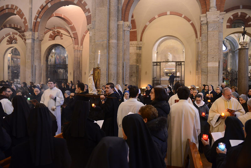 Le fiammelle accese, simbolo dell’unica luce di Cristo, portate tra le mani anche da alcune religiose, la breve processione verso l’altare maggiore, guidata dalla bella e antica icona della Madre di Cristo, la trentina di concelebranti – in maggioranza appartenenti a Ordini e Congregazioni –, il canto ambrosiano dei Dodici Kyrie e del Gloria, sono il segno tangibile della grande partecipazione, in un clima di raccoglimento, a questo momento di fede e di gioia condivisa.