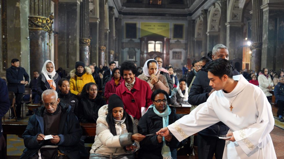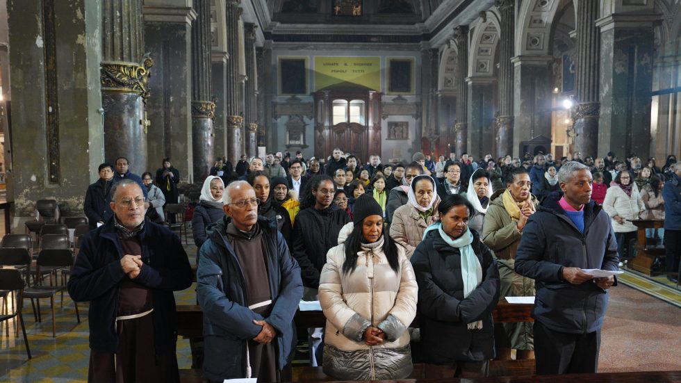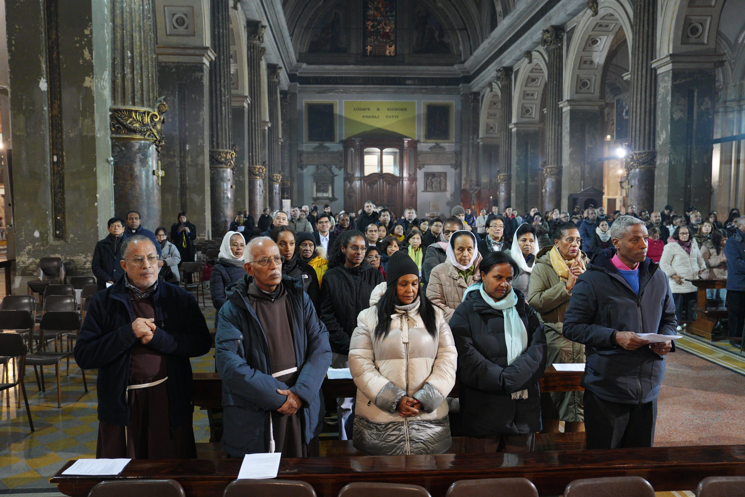 In quella grande Chiesa dalle Genti che è la Diocesi di Milano, fatta da latinoamericani, filippini, srilankesi, coreani, cinesi, libanesi, etiopi copti, romeni, ucraini, polacchi, eritrei, solo per citare alcune delle comunità partecipanti alla serata, presentate da don Alberto Vitali, responsabile della Pastorale dei migranti e parroco di Santo Stefano, che spiega: «Questo momento molto desiderato e gradito, diventa – nell’anno del Giubileo della Speranza – segno dell’impegno che vogliamo assumerci di essere testimoni di speranza. Se ci guardiamo intorno viene la tentazione di scoraggiarci: abbiamo pregato tanto per una pace che ancora non si vede. Ma proprio nell’ultimo Discorso di Sant’Ambrogio, l’Arcivescovo ci ha ricordato che abbiamo una responsabilità nei confronti della città e di questa umanità».