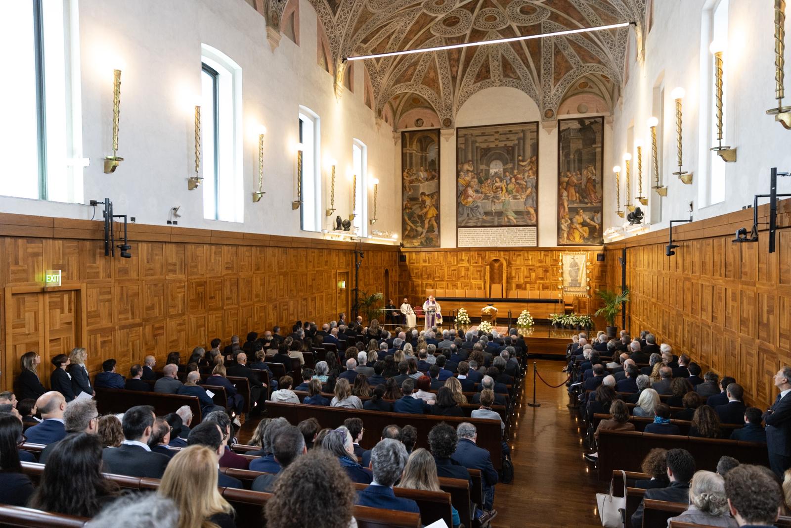 Nell’Aula Magna dell’ateneo, gremita attorno al feretro con appoggiata sopra la toga e l’ermellino peculiare dei rettori e dei presidi di Facoltà, la comunità dell’Università si stringe intorno a chi ne è stato alla guida per 12 anni. La preghiera è segnata dall’emozione e da uno sgomento trattenuto che non passa con il passare dei giorni. Accanto a monsignor Delpini siedono il cardinale Matteo Maria Zuppi, presidente della Cei e arcivescovo di Bologna, e l’assistente ecclesiastico generale della Cattolica monsignor Claudio Giuliodori.