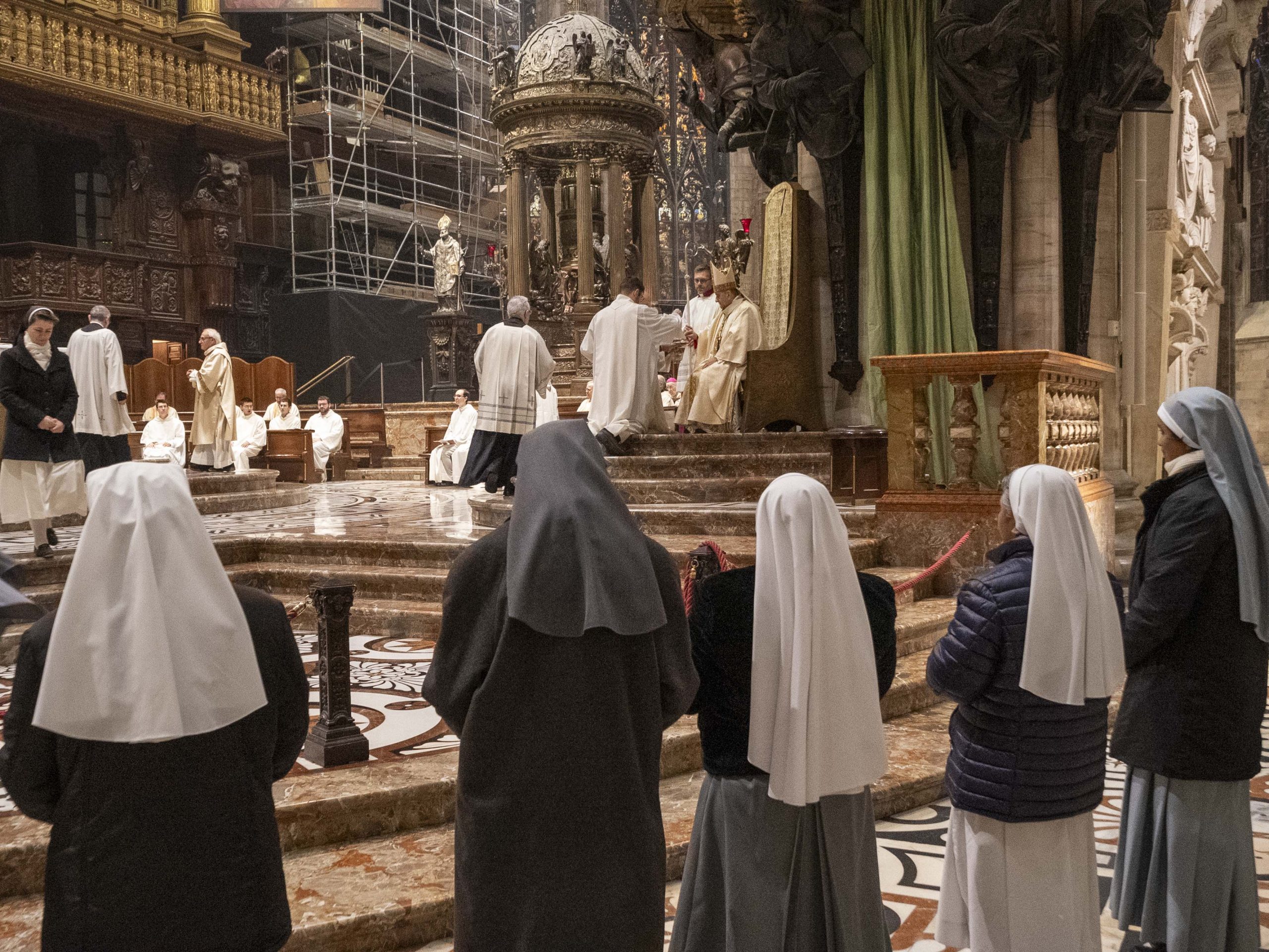 Relazioni da vivere con quello spirito fraterno che si respira poco dopo in Duomo, dove il vescovo Mario presiede l’Eucaristia – concelebrata, tra gli altri, dai vescovi Mascheroni, Agnesi e Raimondi, membri del Cem e dall’abate cistercense di Chiaravalle, Stefano Zanolini, e da molti religiosi – alla quale prendono parte centinaia di consacrate e consacrati.