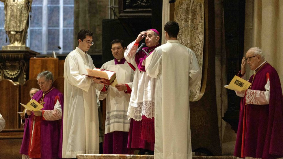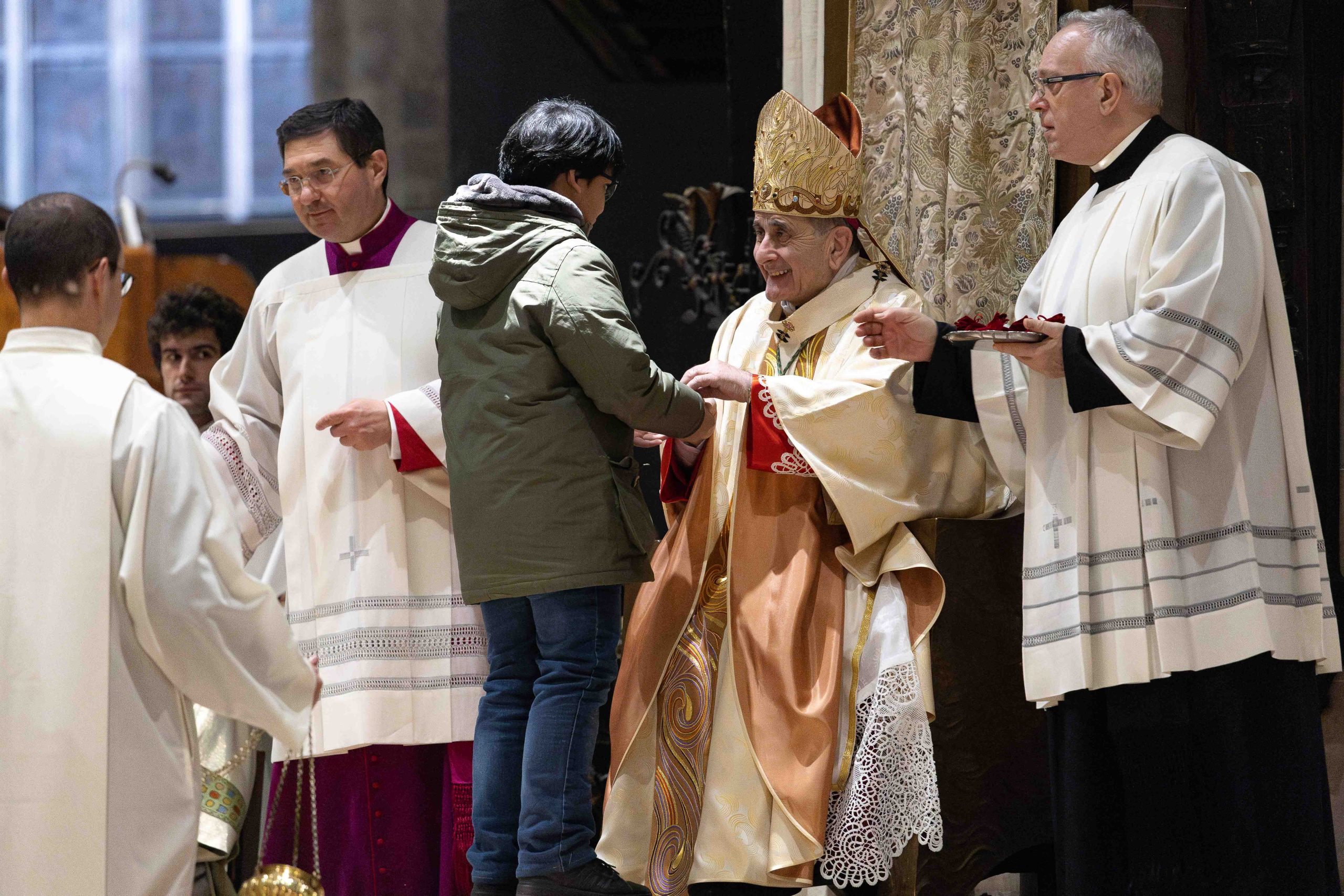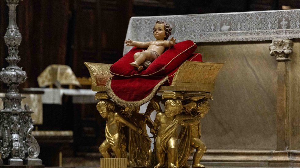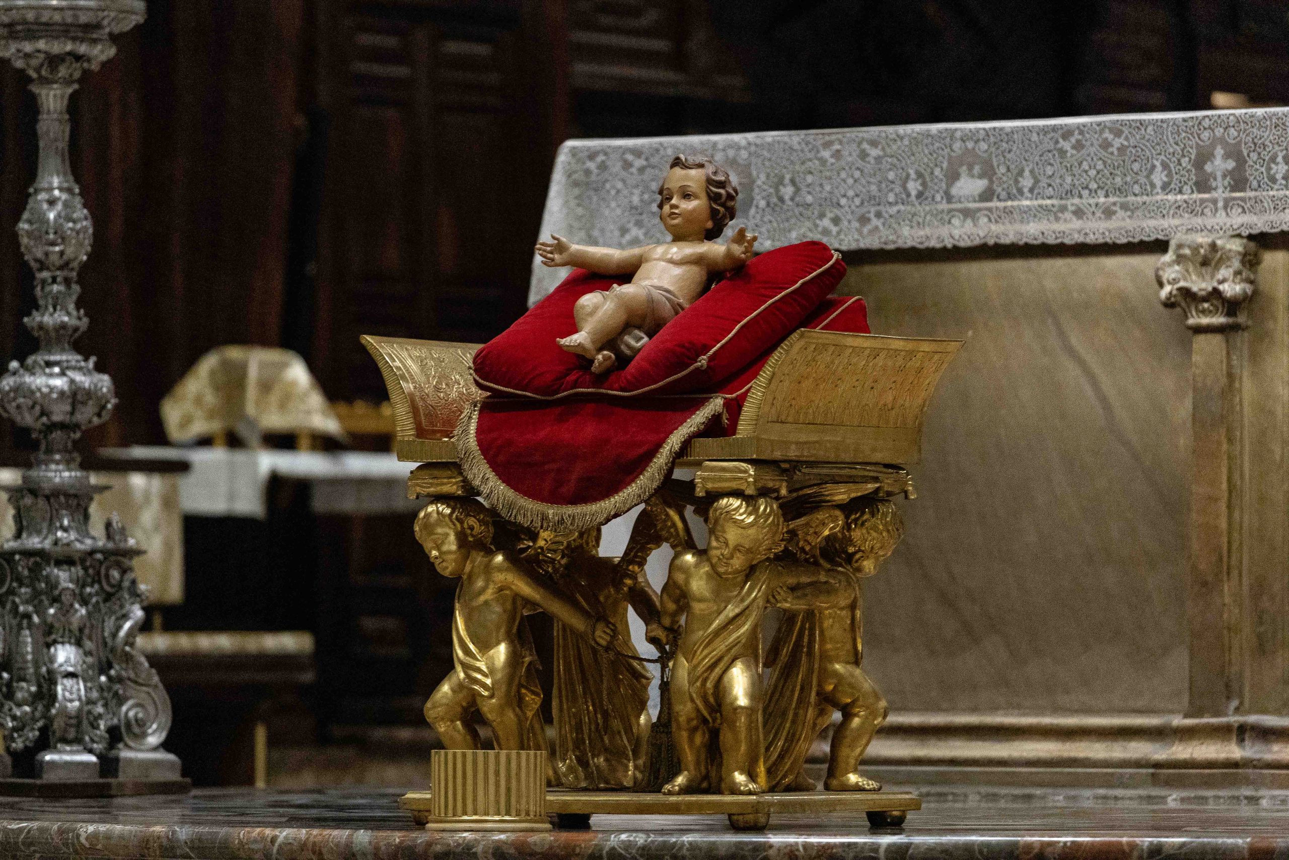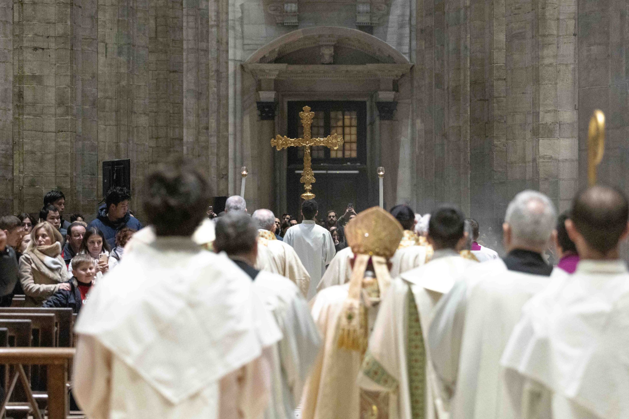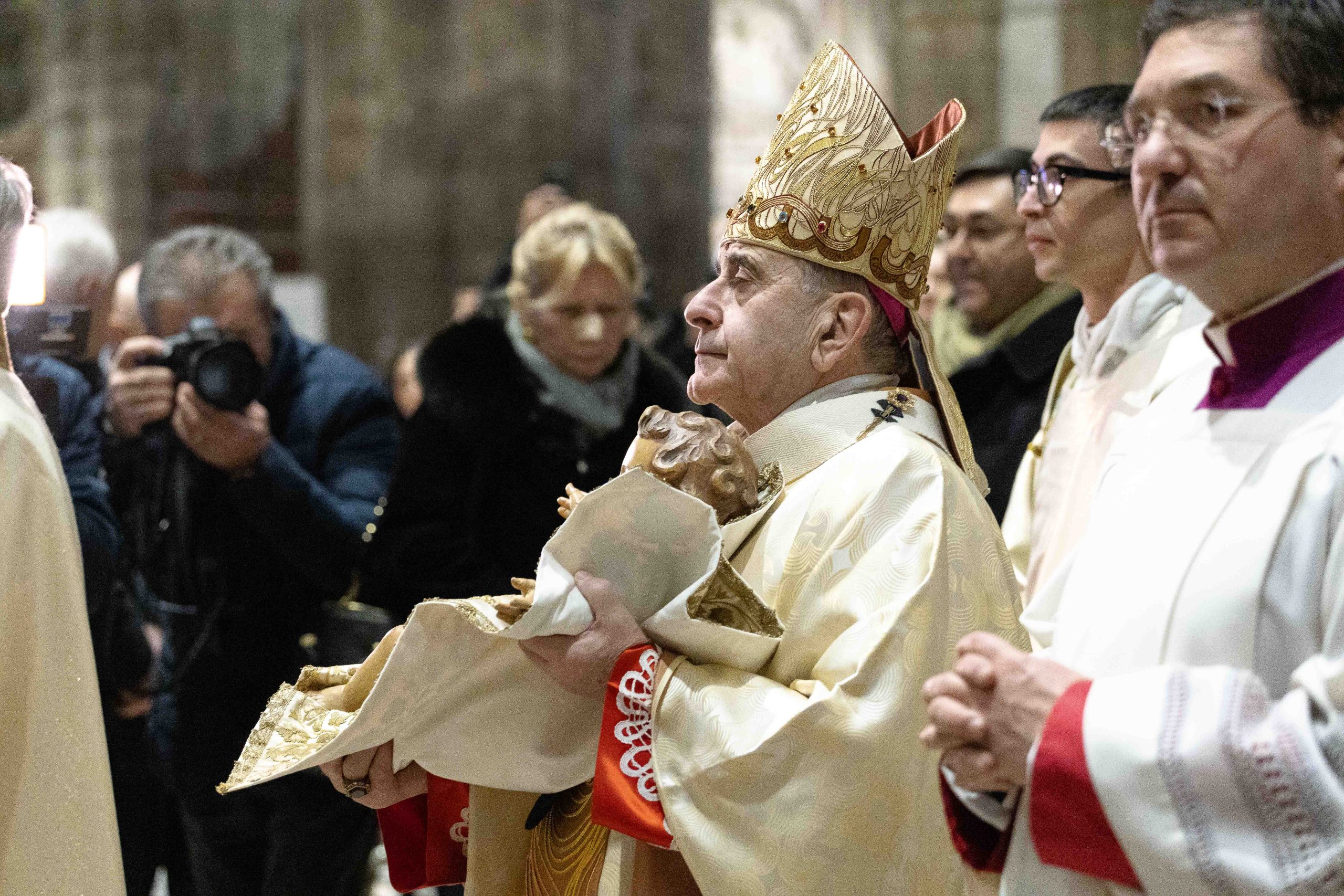 Dopo la Veglia di preghiera, celebrata sempre in Cattedrale in forma di Mattutino – in cui viene letta la pagina peculiare del Rito ambrosiano tratta dall’Esposizione del Vangelo secondo Luca di Sant’Ambrogio -, la Messa solenne si apre con la processione di ingresso e con monsignor Delpini che reca tra le mani velate la semplice statua lignea di Gesù Bambino, poi deposta nella culla ai piedi dell’altare maggiore. Simbolo di ogni immagine del Signore che nasce per tutti e sempre, tra le luminarie opulente delle città dell’occidente, tra le vie «su cui si affacciano infinite vetrine», per usare un’espressione di monsignor Depini, e le macerie delle città bombardate, su cui si sofferma il nostro sguardo spesso troppo superficiale.