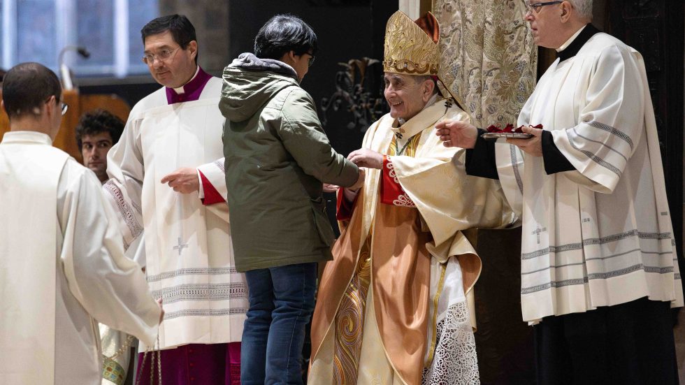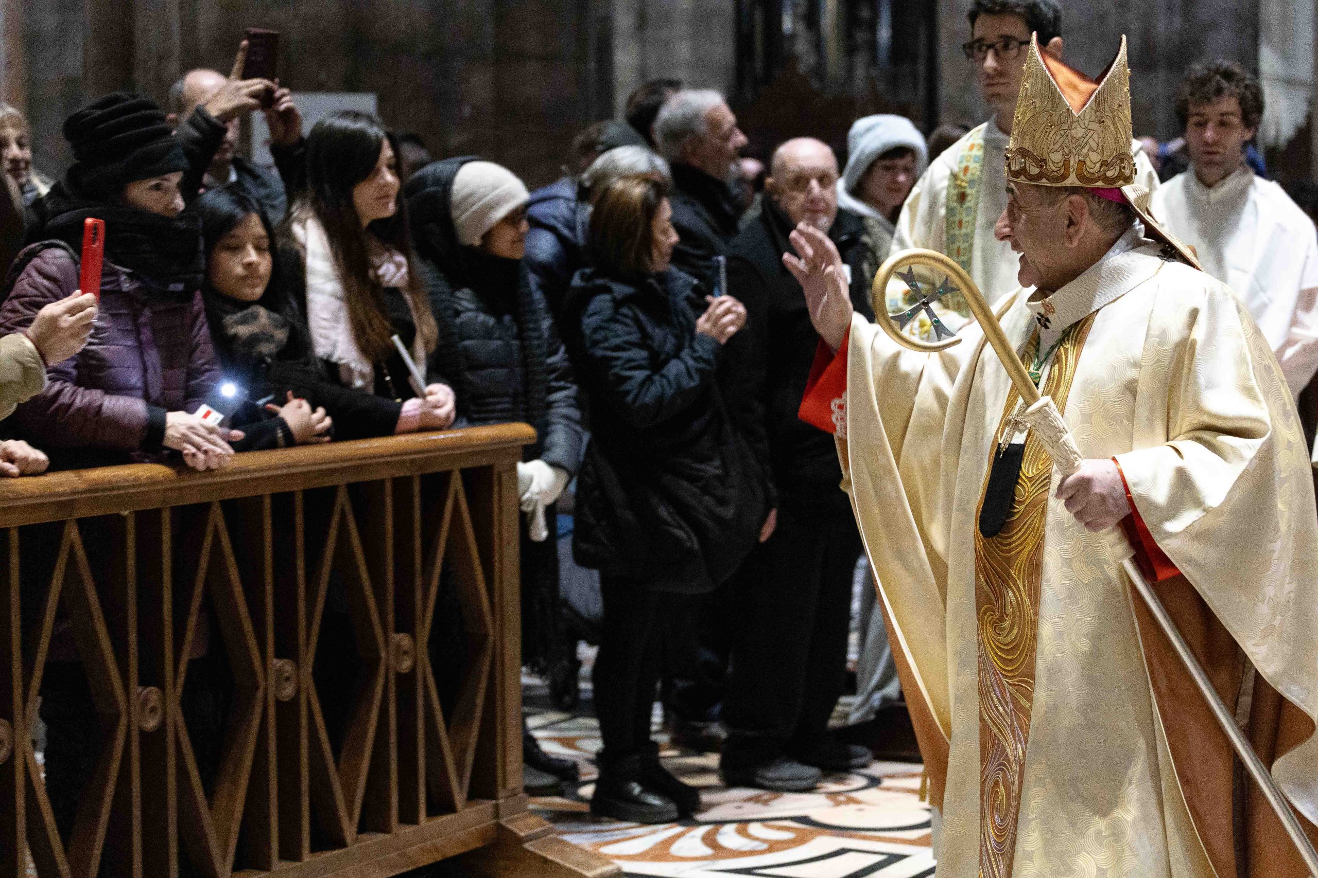 L’Arcivescovo saluta i fedeli al termine della celebrazione (Agenzia Fotogramma)