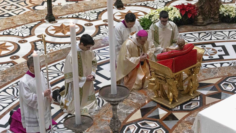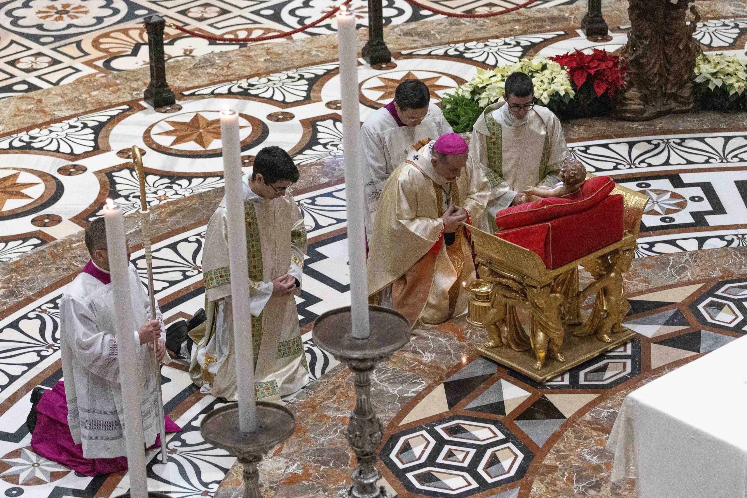 E, alla fine della celebrazione, ancora un augurio di buon Natale, «che non è come augurare buone vacanze, ma significa augurare di contemplare la gloria del Figlio unigenito e di trovare in lui la rivelazione di Dio, la direzione da seguire, la vita da condividere. Che questi siano giorni di gioia, di pace e che, insieme, possiamo essere pellegrini di speranza, credendo alla promessa che ci fa il Signore».
