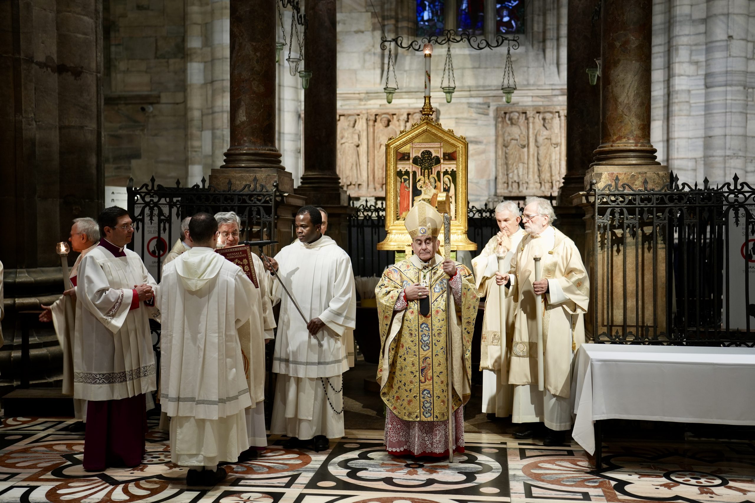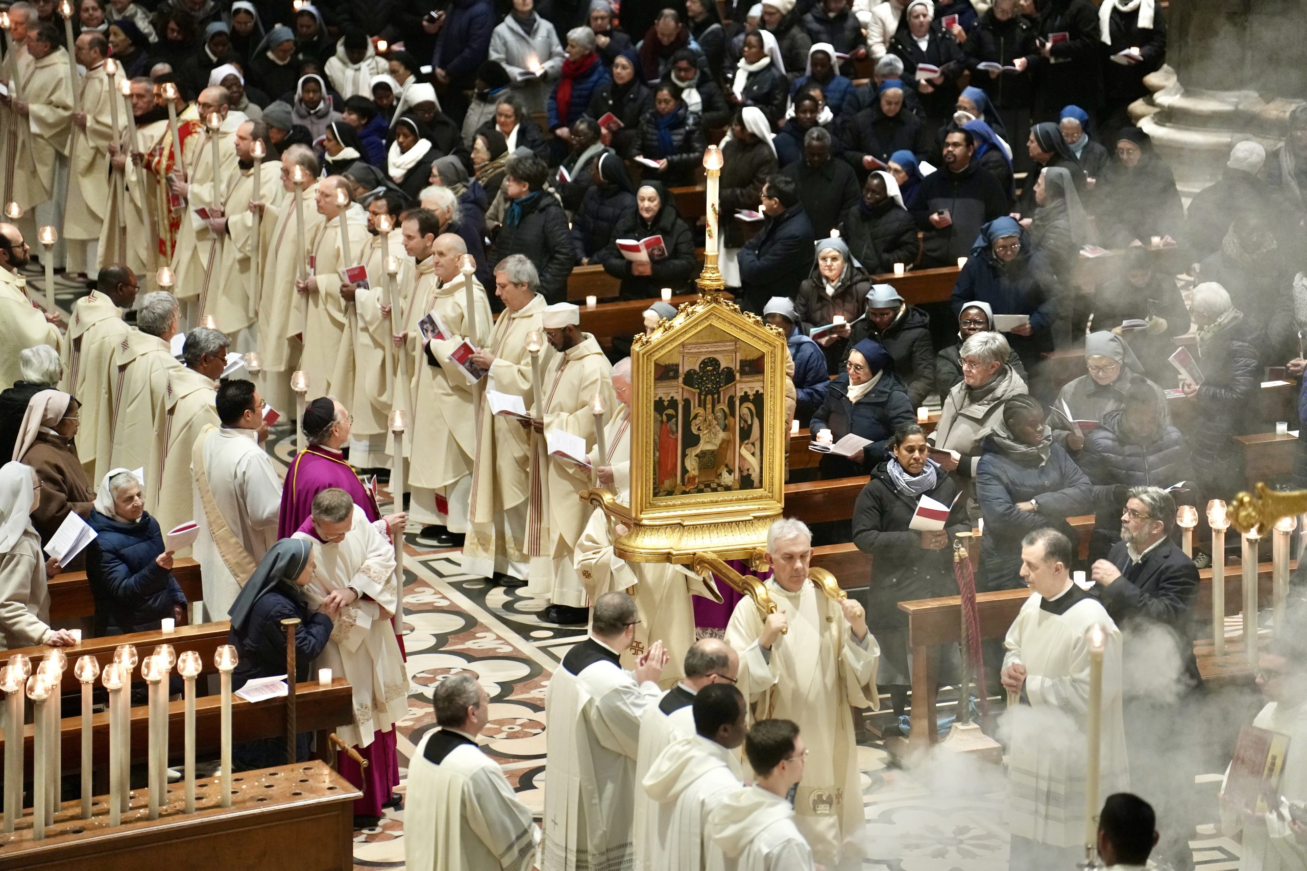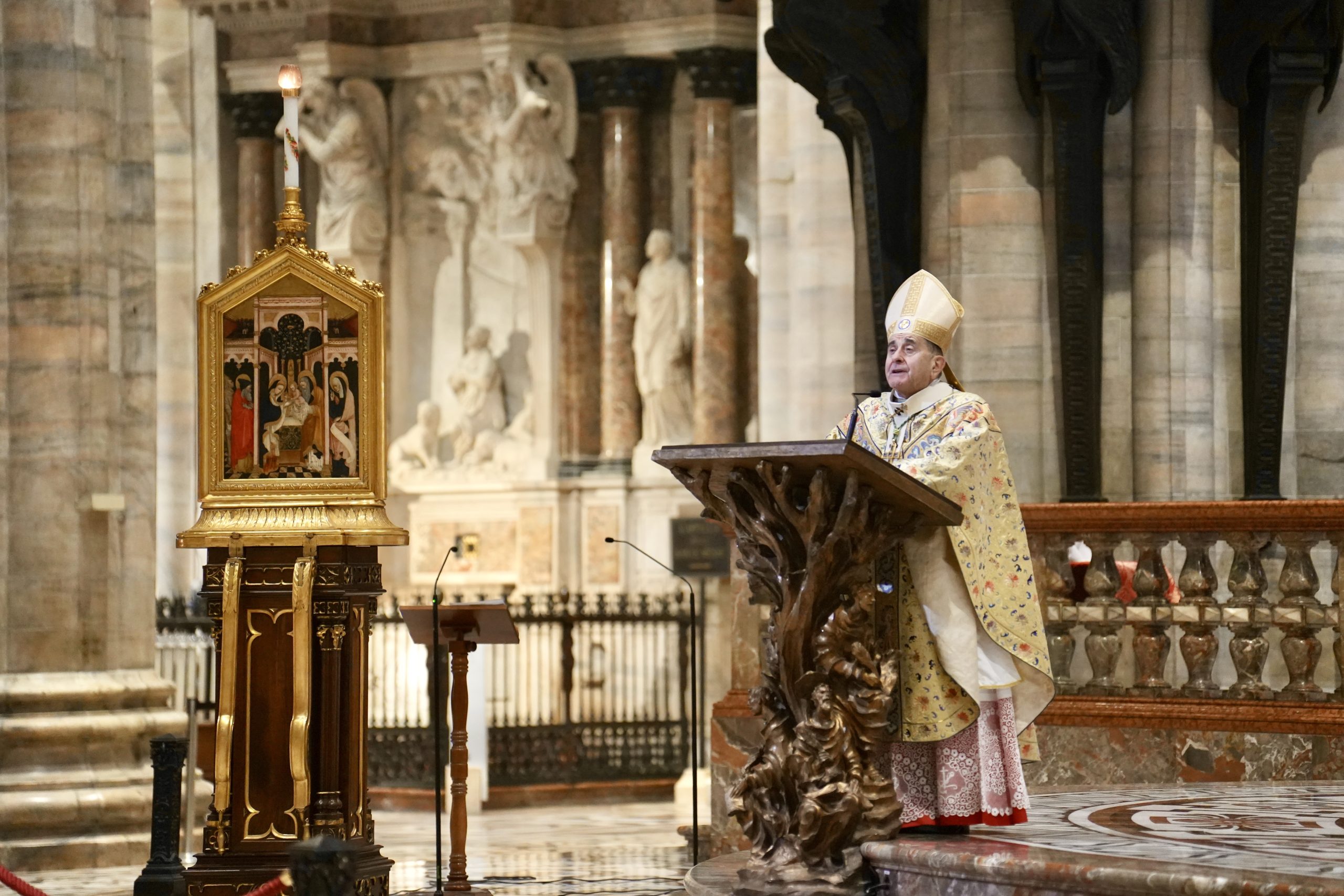 Dopo l’ingresso dal grande portale centrale del Duomo, presso il battistero di epoca borromaica l’Arcivescovo asperge candele e lumini portati tra le mani dai sacerdoti e dalle religiose con l’acqua benedetta e si avvia la processione nella navata maggiore con la venerata immagine dell’icona della Madonna dell’Idea. A concelebrare il rito oltre 60 sacerdoti, tra cui il vicario episcopale per la Vita consacrata monsignor Walter Magni, molti religiosi e i Canonici del Capitolo Metropolitano con l’arciprete, monsignor Gianantonio Borgonovo, che richiama il significato della Messa che, a 40 giorni dal Natale, ricorda la Presentazione del Signore al Tempio.