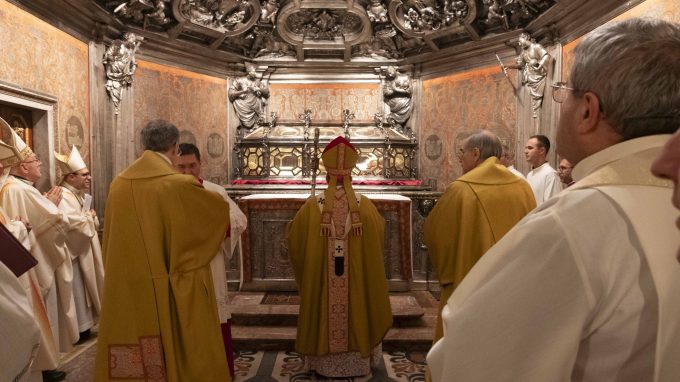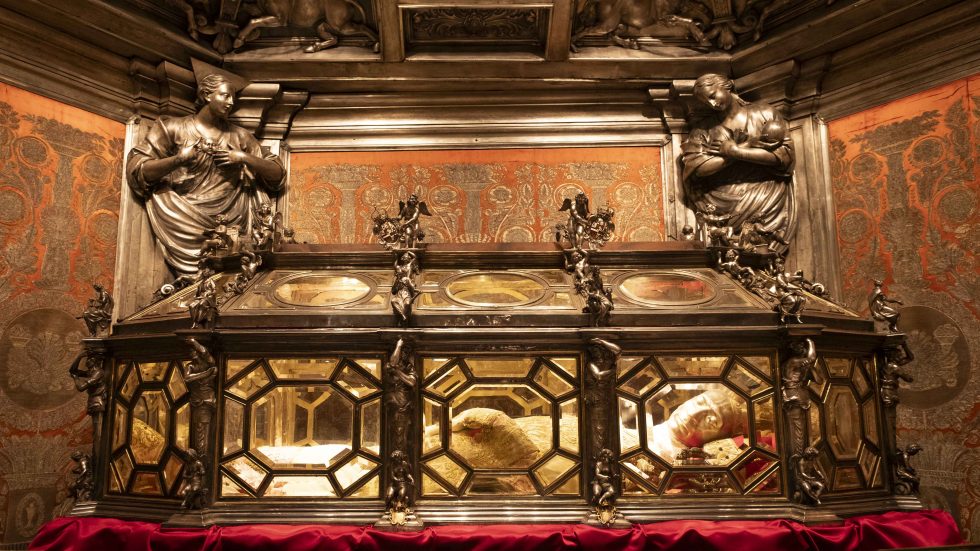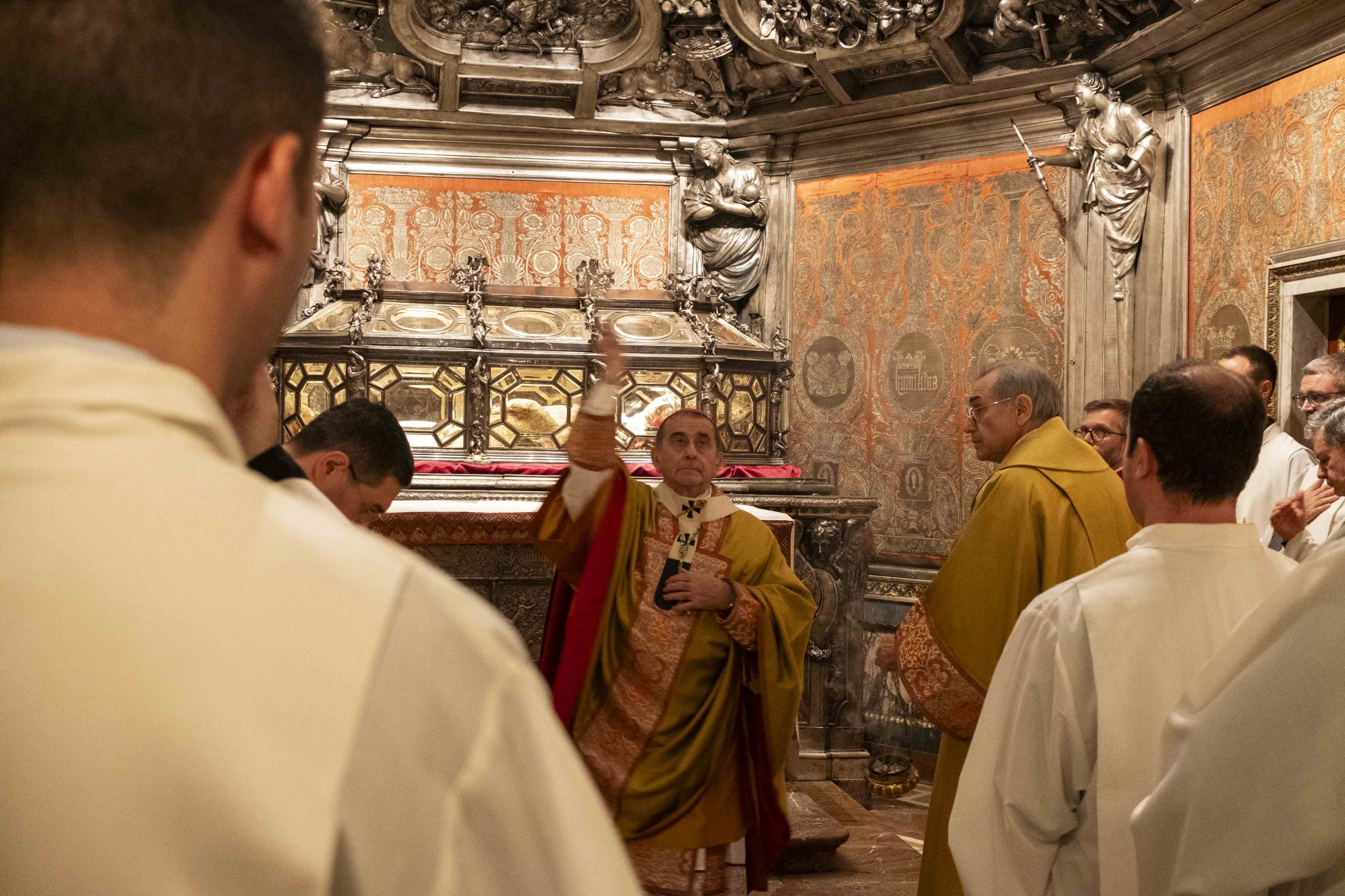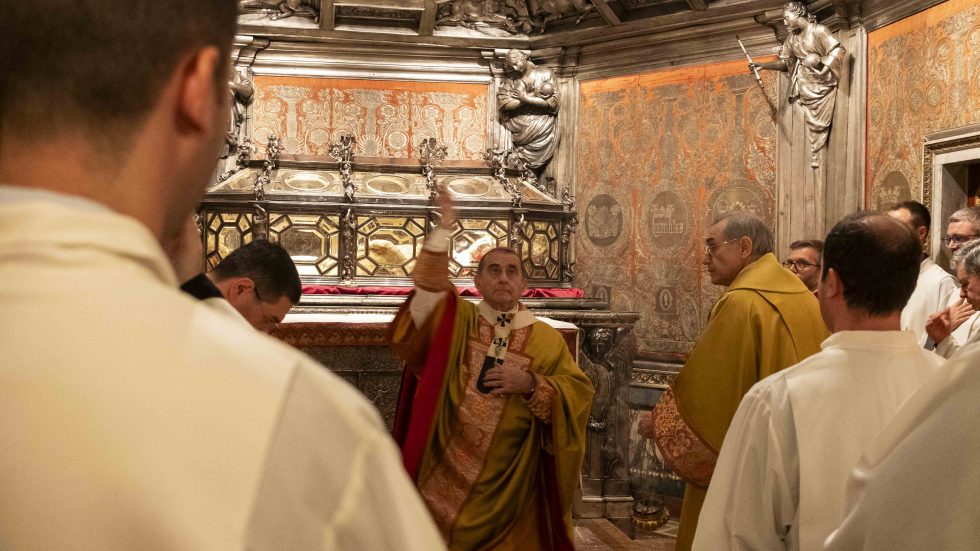 Infine, dopo la benedizione finale dell’assemblea, la discesa dell’Arcivescovo, accompagnato dai Vescovi concelebranti, nello Scurolo barocco sottostante al presbiterio, che conserva l’urna del Santo, tornato splendido nella luce che illumina gli artistici particolari argentei e dorati riportati alla loro originaria ricchezza e bellezza decorativa, finalmente pienamente fruibili. Il canto della sallenda “Respice”, tradizionale nella festa del Borromeo, la preghiera, l’aspersione con l’acqua benedetta e l’incensazione dell’urna di san Carlo concludono la Solennità.