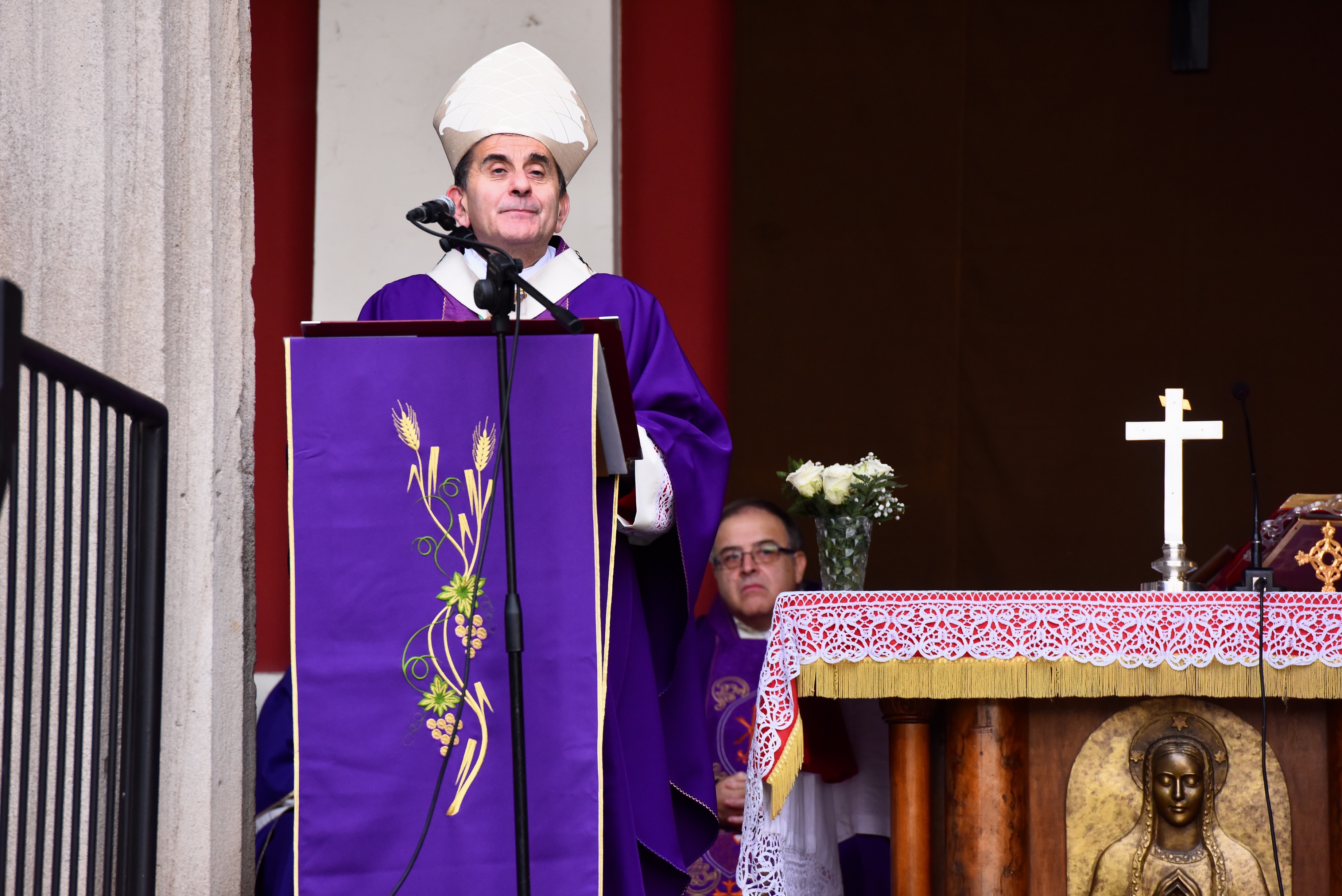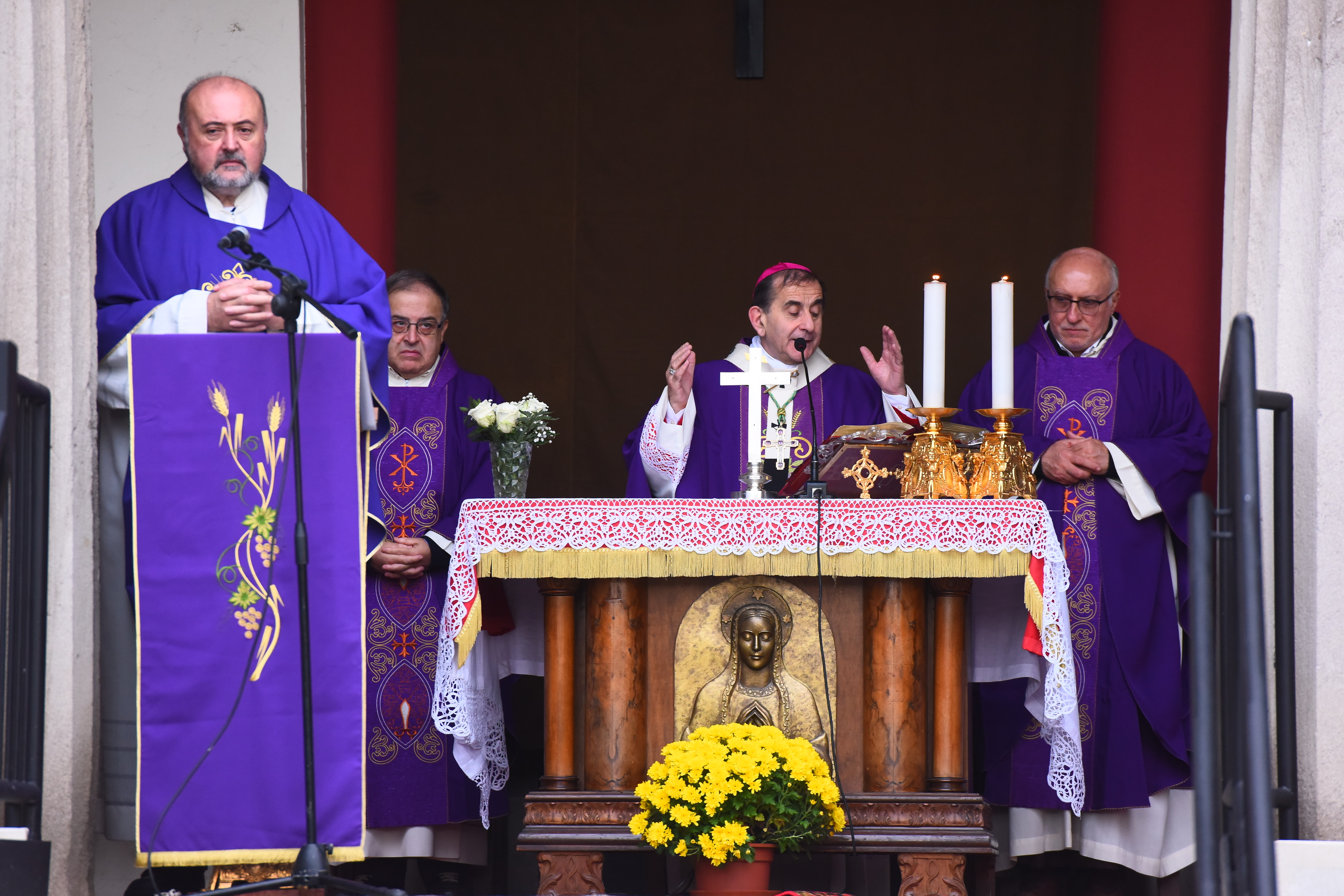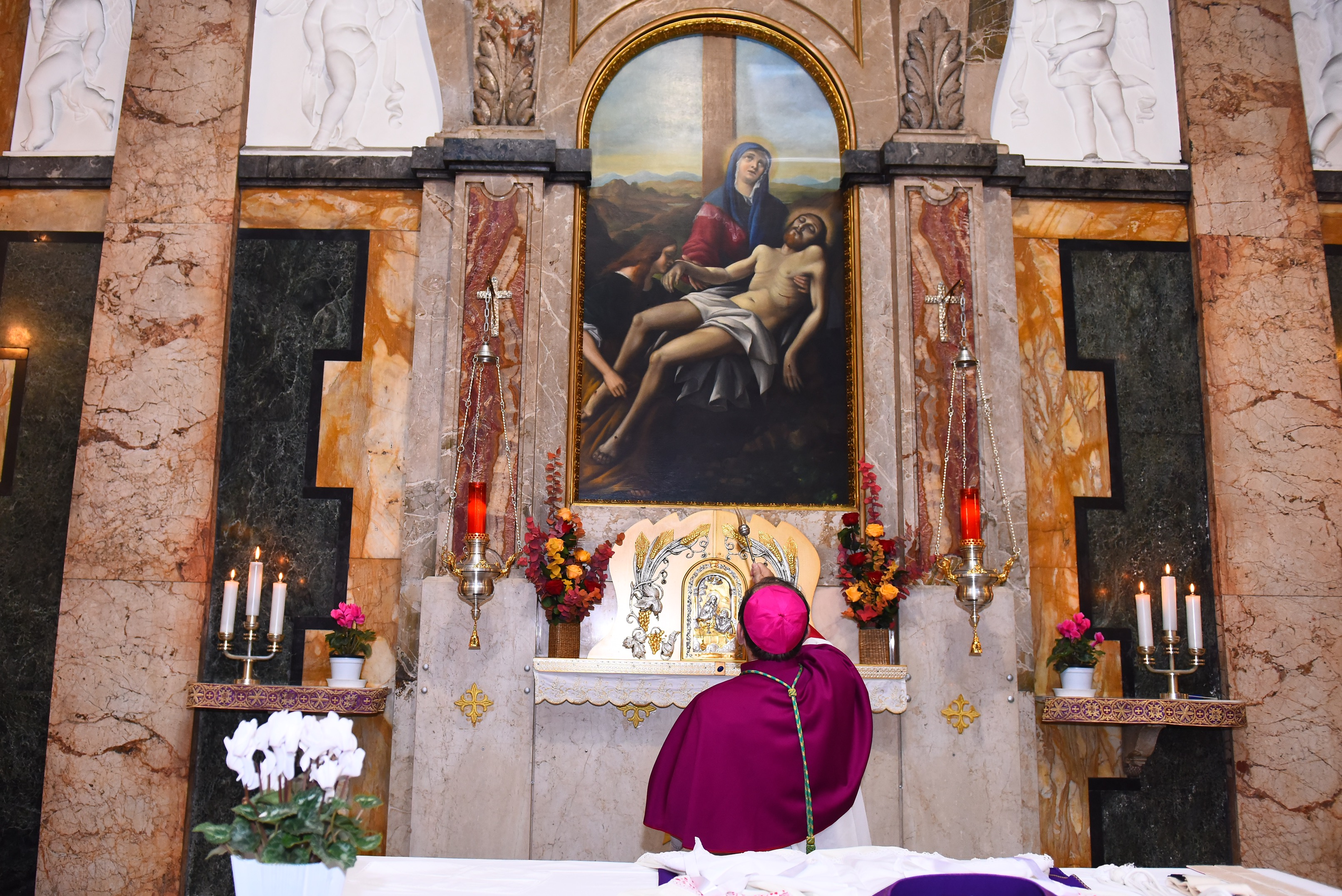 Il riferimento è alla Madonna alla quale è dedicata la restaurata pala d’altare della chiesa del Cimitero, benedetta dall’Arcivescovo stesso prima della Messa, dopo i gravi danni venuti dall’atto vandalico del 25 gennaio 2012 quando, per strappare la catenina d’oro alla venerata immagine di “Santa Maria alla Pietà in Camposanto”, il quadro subì gravi danni.