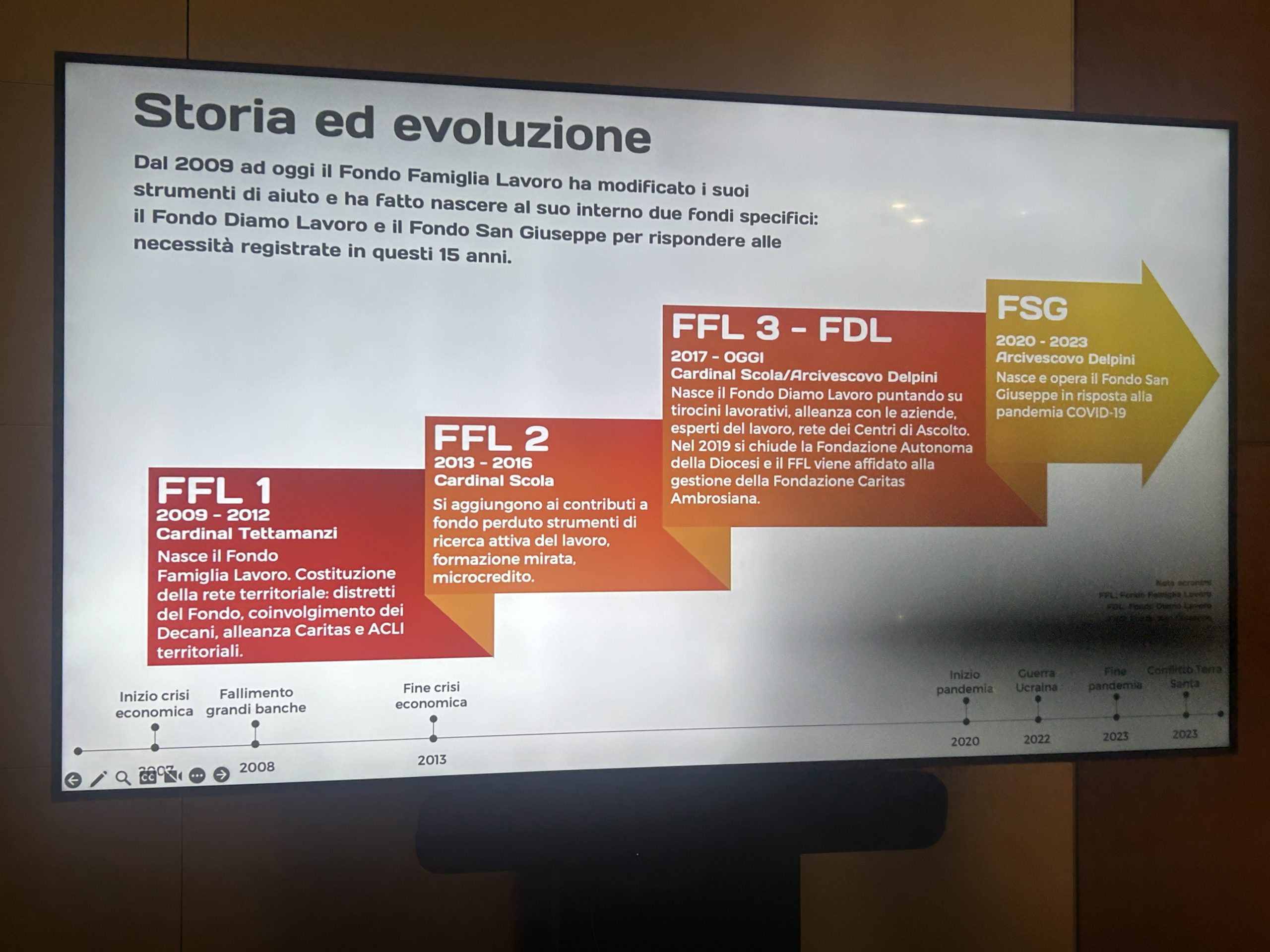 Tutti questi interventi erano stati preceduti dalla relazione di Luciano Gualzetti (vedi qui le slides proiettate), direttore di Caritas Ambrosiana, che tra le altre cose è servita a evidenziare la parabola storica dei Fondi diocesani di sostegno a persone e famiglie in difficoltà a causa della perdita o mancanza di lavoro.