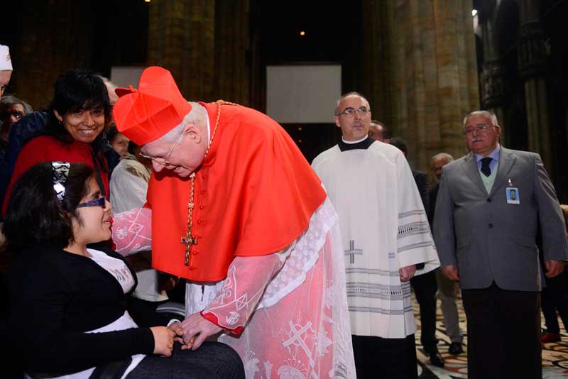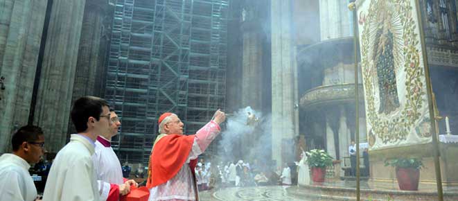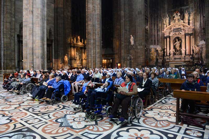 Fuori, la pioggia di una sera scura che scende sulla grande città pare rendere ancora più bella e viva la luce che si diffonde tra le navate affollate del Duomo, dove giungono, da tutta la diocesi, gruppi parrocchiali, fedeli accompagnati dai sacerdoti che svolgono il ministero pastorale nei tanti Santuari Mariani della nostra Chiesa, intere famiglie, riunite per la celebrazione del Rosario meditato e presieduto dal Cardinale Scola. Che, come già l’anno scorso, ha voluto questo momento di preghiera nella casa di tutti i milanesi che si vuole aprire anche a chi viene da lontano o si ‘sente’, in altro senso, lontano. Arrivano anche persone in difficoltà lavorativa, in crisi, non solo economica, i malati – molti, nonostante il tempo inclemente guidati dall’Oftal e dall’Unitalsi – e, poi, i giovani appartenenti a comunità straniere: insomma, il mondo che siamo noi, la comunità non solo dei credenti, ma proprio di tutti noi.