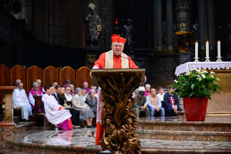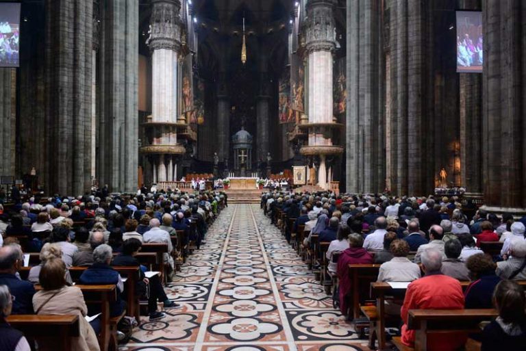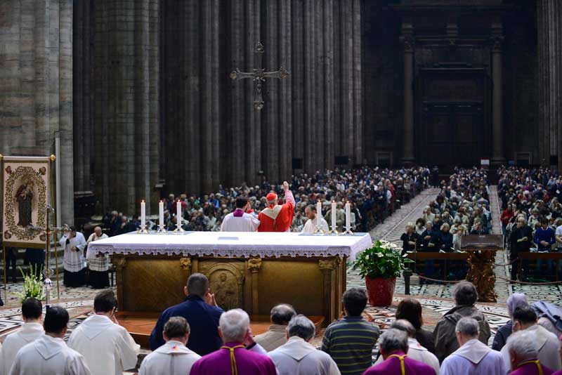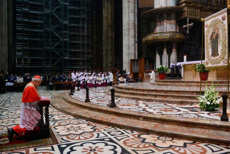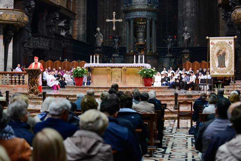 E così l’adempimento di questa recita comunitaria – indicata, peraltro, dall’Arcivescovo fin da settembre nella sua Lettera pastorale – rende a pieno visibile l’essere testimoni del Vangelo, nel nome di Maria, “figlia del suo Figlio”. Credenti che, in Duomo, camminano seguendo idealmente e concretamente in processione – all’avvio della celebrazione – lo stendardo della “Madonna del Rosario”, muovendo, non come tradizione dall’altare cosiddetto della Madonna dell’Albero (la cui dedicazione, che si deve a San Carlo è, invece, appunto alla Madonna del Rosario ora in restauro), ma dall’altare di San Giovanni Bono.
