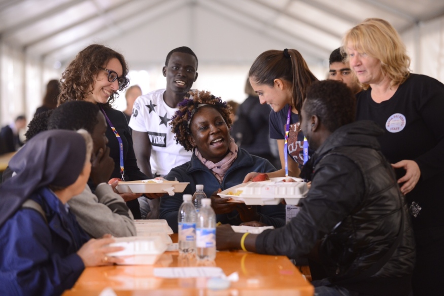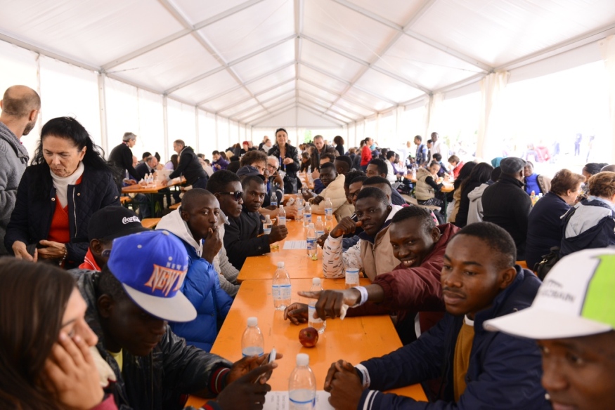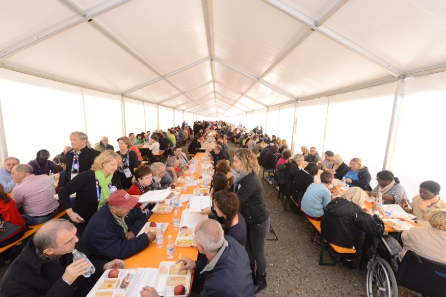 Sotto la tensostruttura, montata nel piazzale antistante Cascina Triulza, sono arrivati a gruppi tra le 12 e le 14 gli invitati della Caritas: complessivamente 1800 persone provenienti dalla strutture di accoglienza di Milano e della Lombardia (64 sono stati gli ospiti arrivati da Mantova, 9 da Pavia, 100 da Crema, 120 da Vigevano, 65 da Lodi, 108 da Brescia, 227 da Bergamo). A loro si sono uniti i visitatori di Expo che hanno acquistato il biglietto di 10 euro per partecipare a questo momento di condivisone.