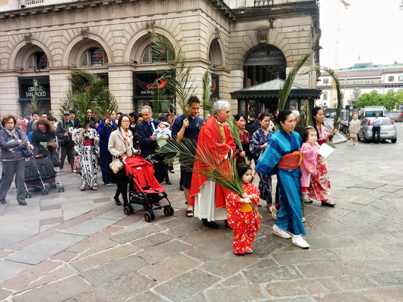 Composto da 500 persone che innalzano rami di ulivo e foglie di palma, il corteo è arricchito anche da alcune presenze significative legate alla spiritualità laicale come l’Arciconfraternita del Sacramento e gli ordini di Malta e del Santo Sepolcro, ma è costituito soprattutto da fedeli di origine straniera (si distinguono i gruppi cinese, africano, polacco, giapponese, coreano, cingalese, ucraino, romeno) particolarmente invitati per l’occasione.