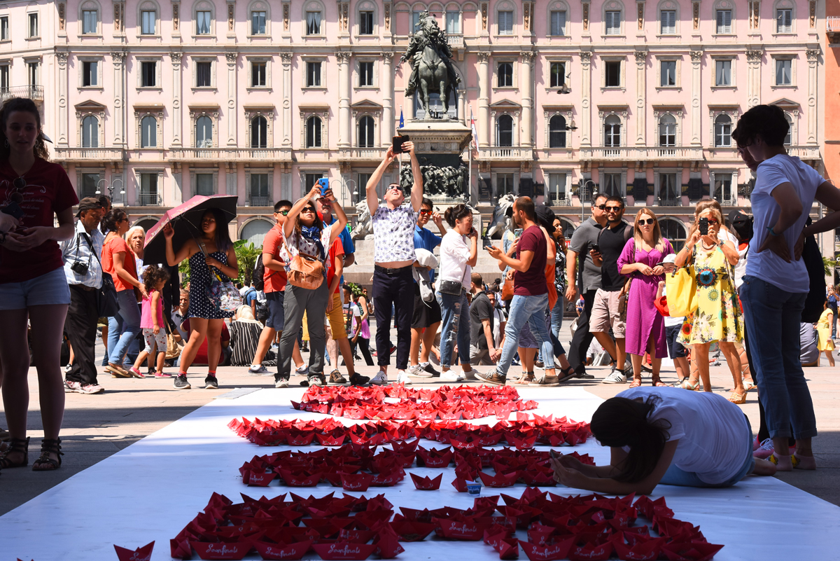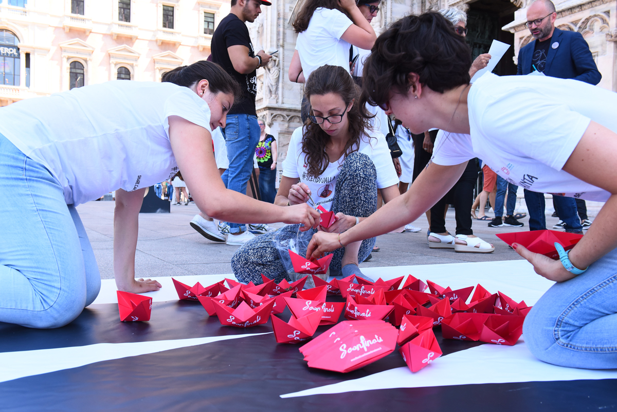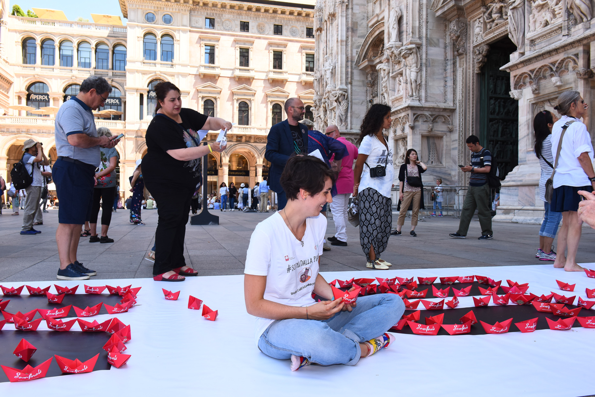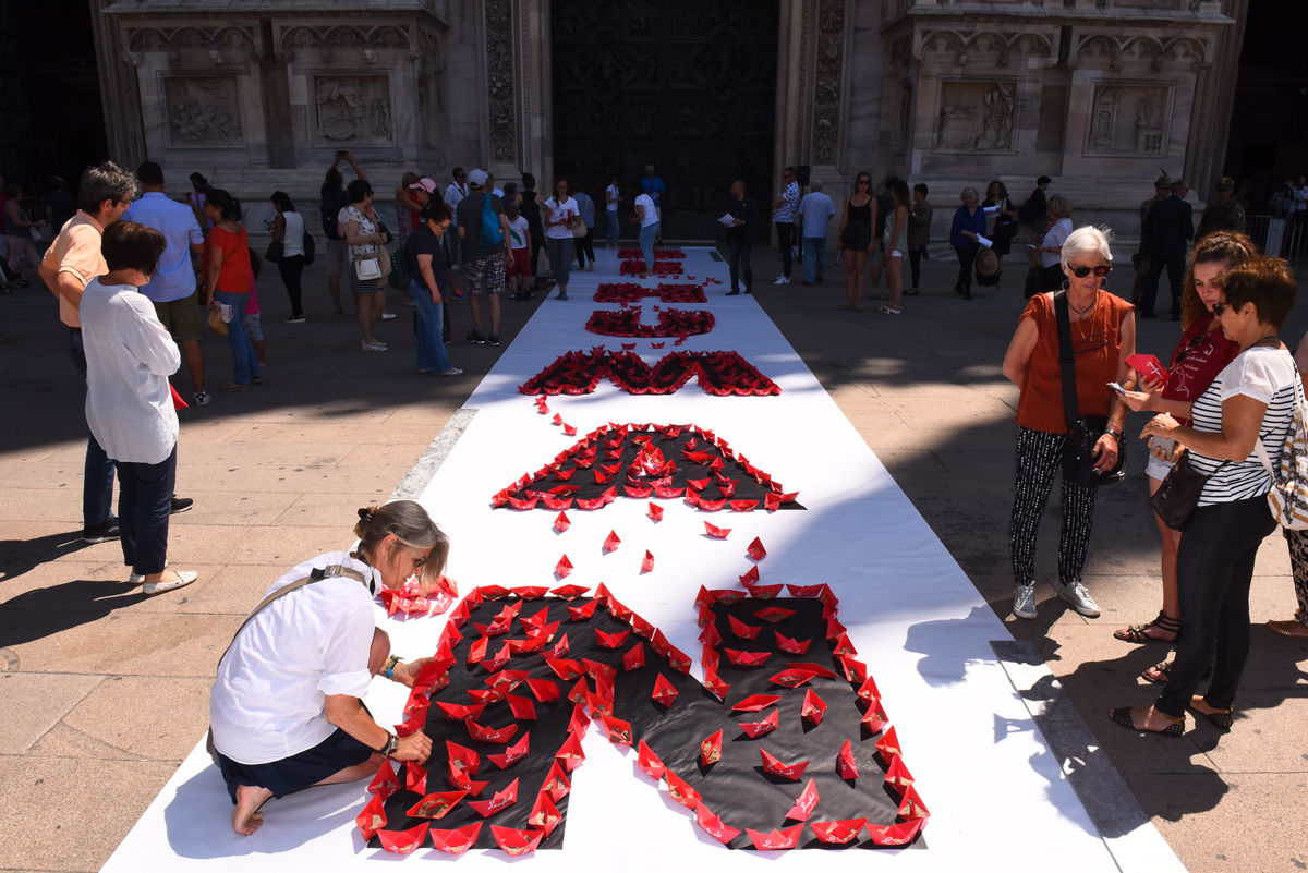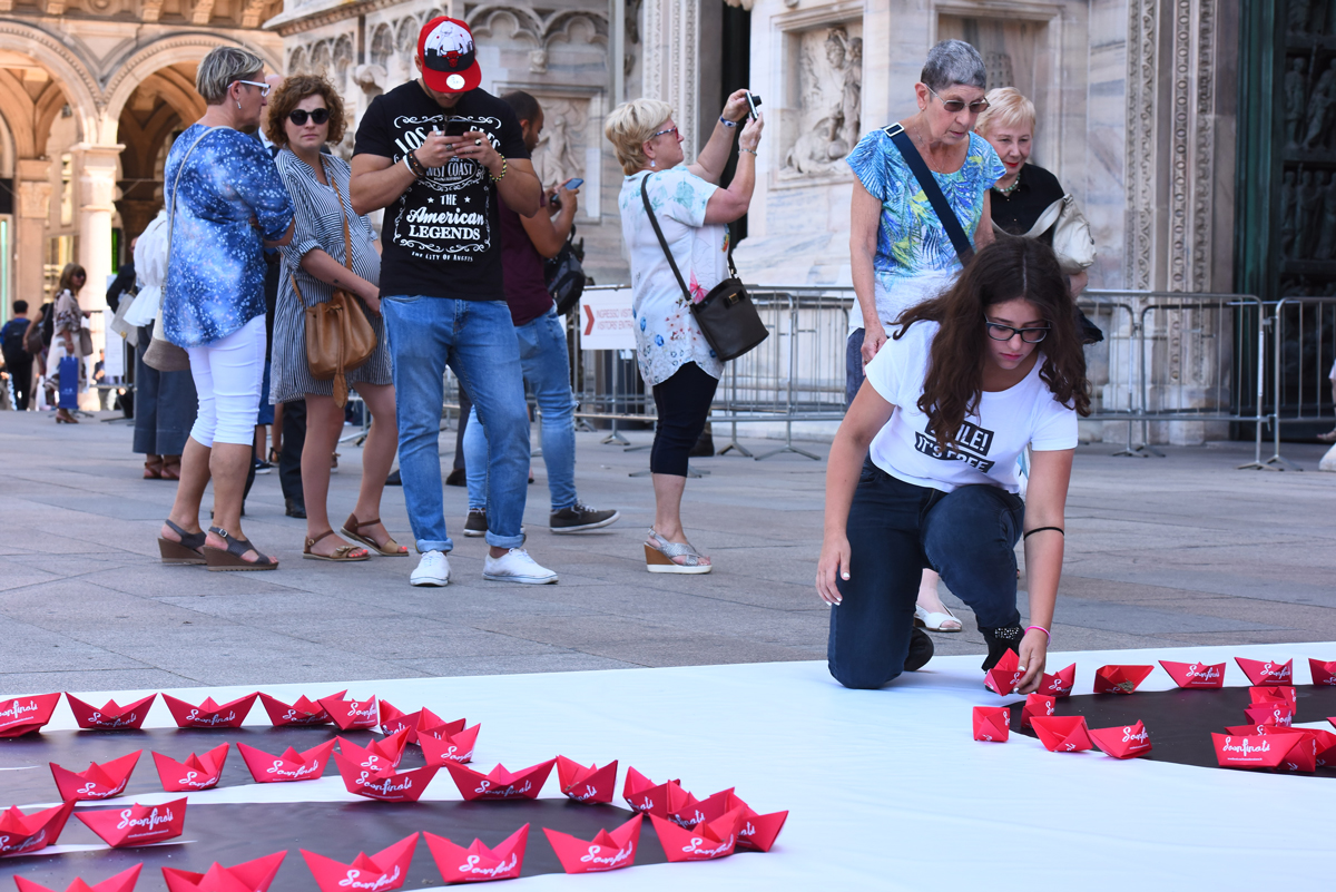 Mercoledì 27 giugno in mattinata un gruppo di giovani volontari di Caritas Ambrosiana ha composto la scritta lunga 20 metri Be Human sul sagrato del Duomo di Milano con 629 barchette rosse di carta. Ad aiutare i volontari si sono uniti molti cittadini che si trovavano in piazza.