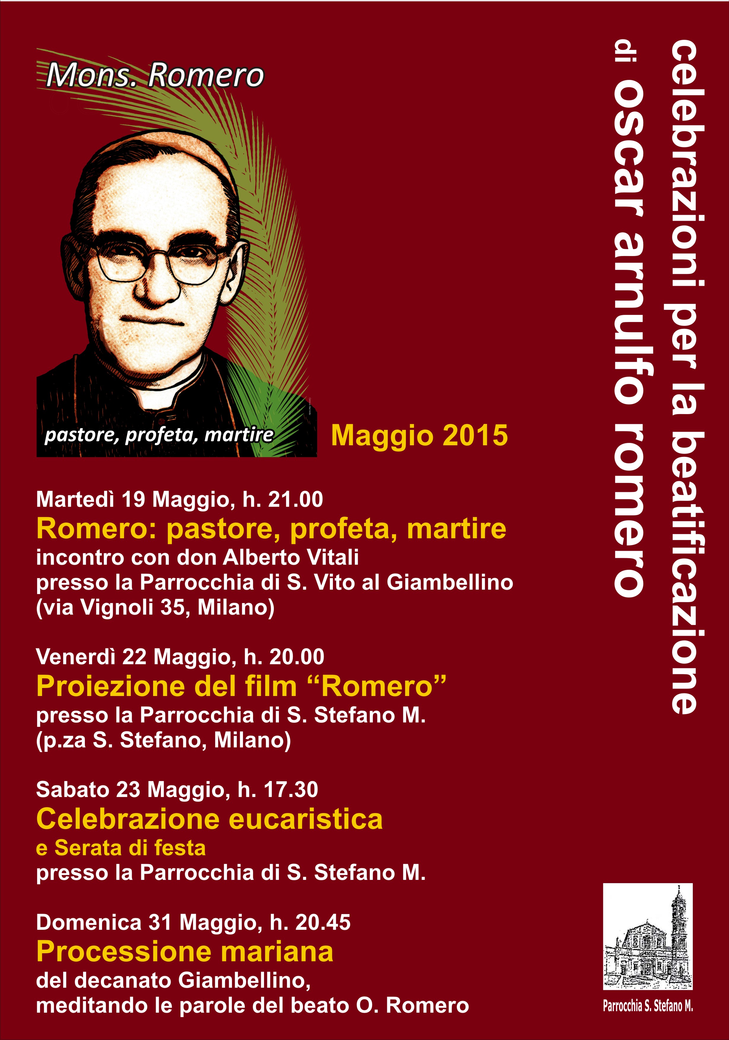 Le due cose si integrano. Prima dell’annuncio della beatificazione, il 19 maggio a San Vito al Giambellino era già stata programmata una serata su di lui. Venerdì 22 maggio a Santo Stefano, invece, verrà proiettato un film sulla sua figura, finanziato dalla Conferenza episcopale americana negli anni Ottanta per promuovere la causa dei salvadoregni. Sabato 23, alle 17.30, sempre in Santo Stefano celebreremo una Messa in contemporanea con la beatificazione presieduta a San Salvador da padre Rutilio Sanchez, già stretto collaboratore di Romero; al termine sarà inaugurato un quadro, che sarà posto su un altare laterale (in allegato nel box in alto a sinistra la locandina della celebrazione e l’immagine del quadro, ndr).
