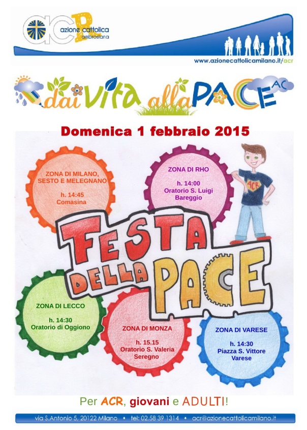 La «Festa della pace» si svolgerà nelle diverse Zone pastorali domenica 1 febbraio. In particolare, a Varese in piazza San Vittore alle 14.30; a Seregno presso l’oratorio Santa Valeria alle 15.15; a Oggiono presso l’oratorio alle 14.30; a Bareggio nell’oratorio San Luigi alle 14; nell’oratorio della Comasina a Milano alle 14.45.
