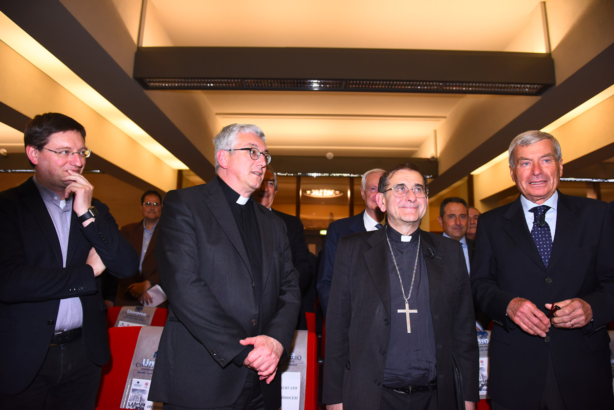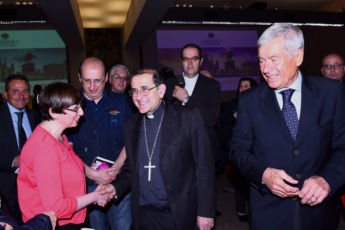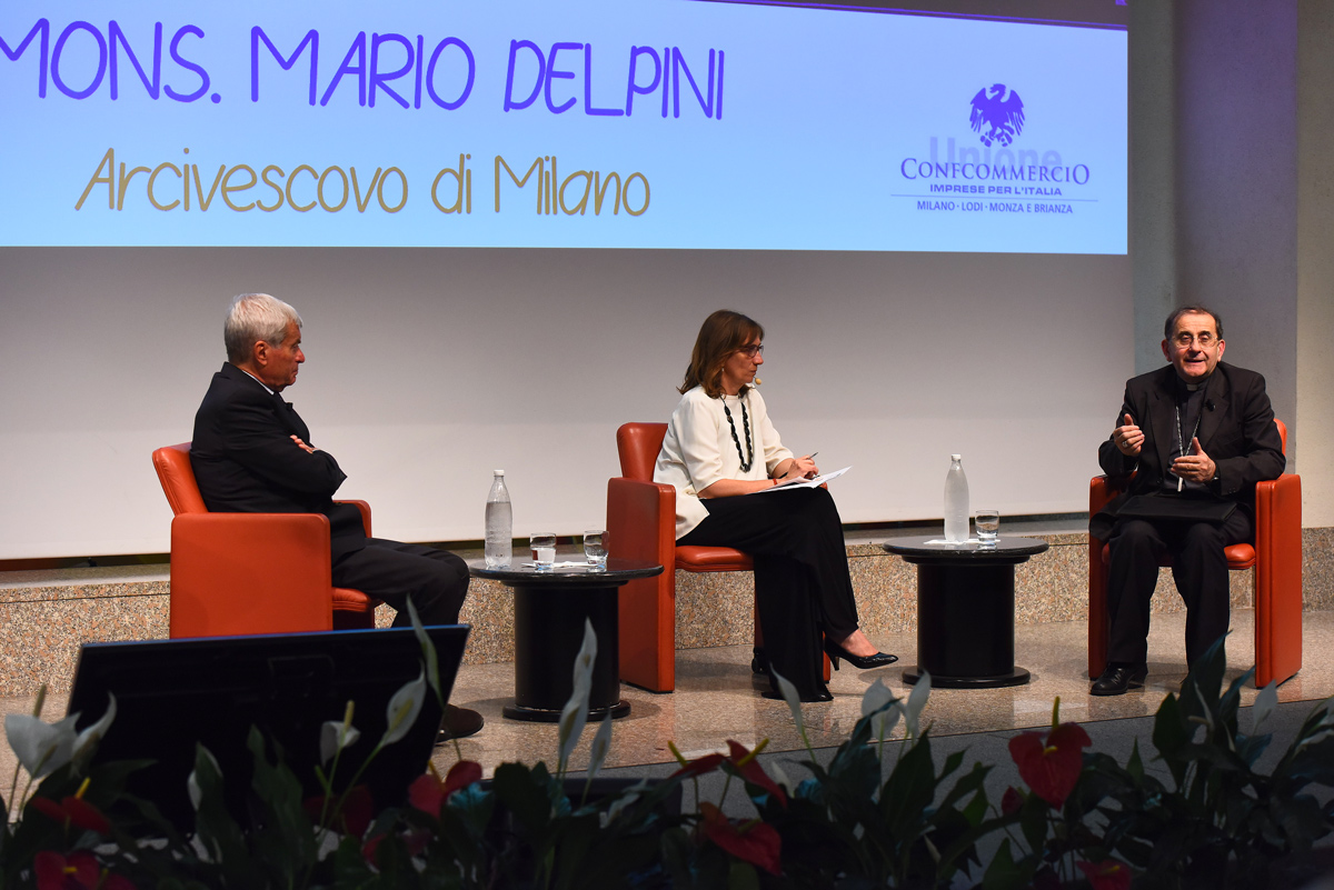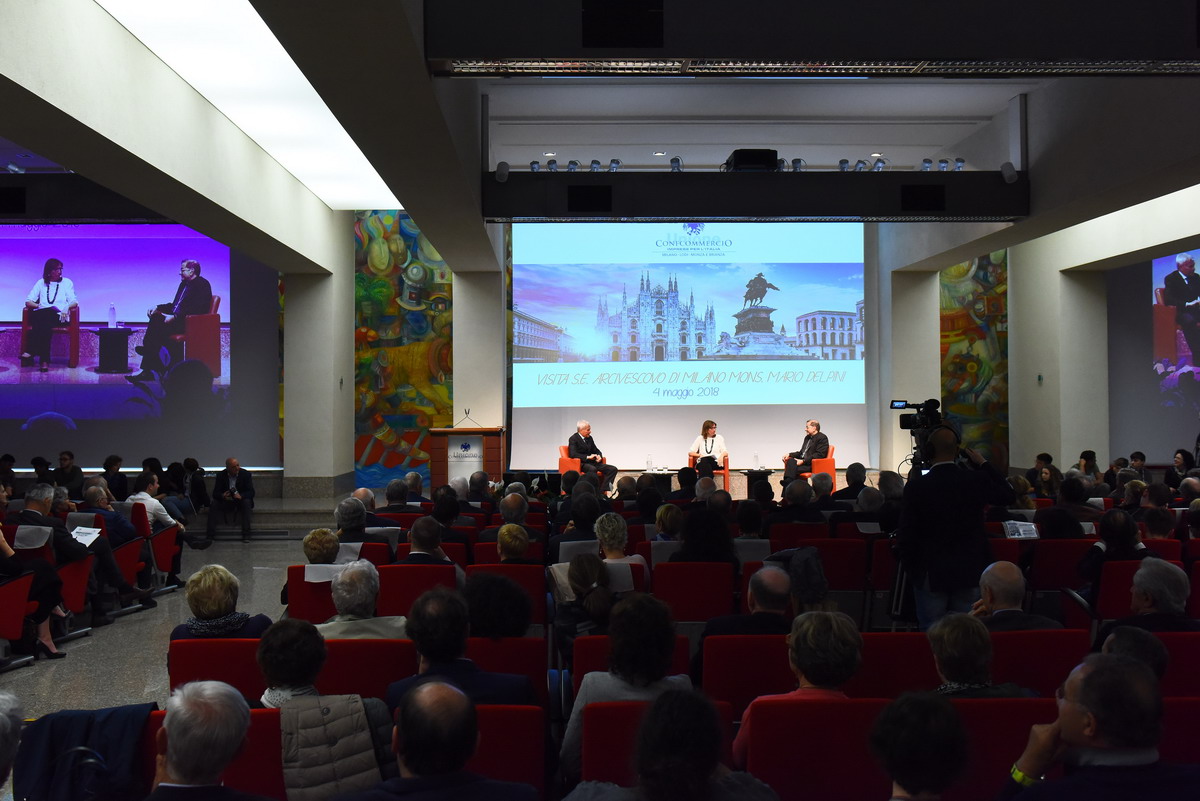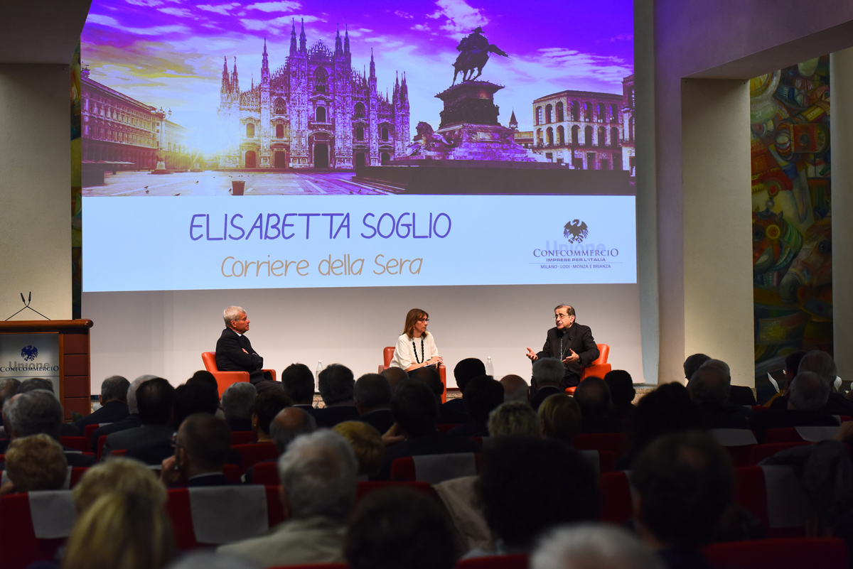 La grande Sala “Orlando” della sede Confcommercio di Milano è gremita – tantissimi i giovani delle scuole – , per la presenza dell’Arcivescovo, che come i suoi predecessori, non viene meno alla ormai tradizionale amicizia con l’Associazione che riunisce coloro che, a Milano, Lodi e Monza Brianza, sono impegnati nel commercio anche a livello imprenditoriale.Non a caso, il dialogo con monsignor Delpini, si apre con una serie di immagini ed espressioni rivolte dai Pastori ambrosiani agli operatori del settore fin dai tempi della ricostruzione. A fare gli onori di casa – non potrebbe essere altrimenti – è il presidente Carlo Sangalli, da tempo alla guida della Confcommercio; modera la giornalista del “Corriere della Sera”, responsabile del supplemento “Buone Notizie”, Elisabetta Soglio.