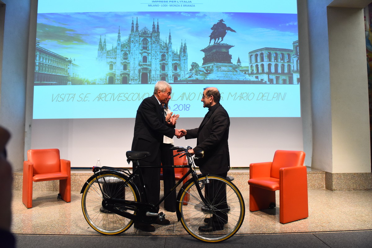 Un ultima parola è sul “lamentarsi”, uno dei famosi editti delpiniani ribadito anche in questo contesto. «Almeno i cristiani dovrebbero sapere che è proibito lamentarsi». E scatta l’applauso soprattutto degli studenti, prima che a Delpini arrivi anche un significativo dono, una bicicletta, portata al centro del palco mentre scorrono le immagini, famose, di un film di don Camillo che, in sella, supera Peppone.