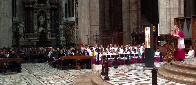 E così in Duomo – dopo la sempre bella elevazione musicale con le musiche di Mendelssohn e le Cinque Corali di Brahms, eseguita dal maestro Vianelli al grande Organo, e la lettura dei brani evangelici e delle testimonianze di Romano il Melode, di Olivier Clément, di Paul Claudel e di San Carlo – risuonano, scandite con una forza particolare, parole che vanno diritte al cuore.