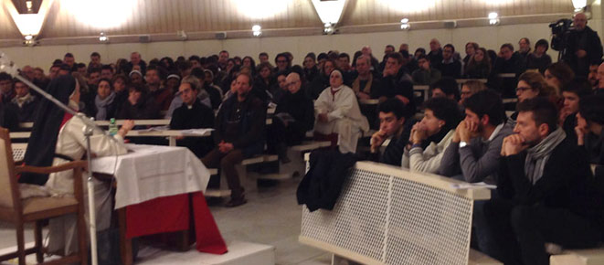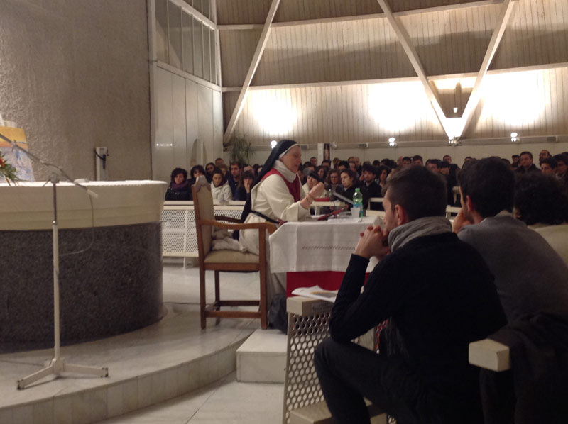 E viene allora in mente che sarebbe bello, avvicinandosi il tempo di Quaresima, continuare a vivere questo “incontro” con l’Eucaristia, tema che, non a caso, viene rilanciato nelle domande finali. Suor Maria Gloria, che ha messo al centro della sua esistenza l’Adorazione eucaristica, indica le vie di una scelta di vicinanza al Signore che definisce «privilegiata nella contemplazione». «Se il battesimo ci fa membra di Cristo, l’Eucaristia ci rende sempre più simili a Lui. Ma essa richiede una familiarità, la capacità di amare senza limiti e noi uomini non siamo capaci di mare senza limiti, nemmeno noi stessi, tanto che spesso riversiamo sugli altri le problematiche che coviamo nel nostro cuore. Dobbiamo aprire questo cuore a Colui che ama senza misura, riuscendo a capire che l’Eucaristia non è il cibo per i perfetti, ma del perfezionamento. Come monaca dell’Adorazione eucaristica, posso dirvi che vi stupirete della forza che viene da tale dimensione, dallo stare davanti a Dio e al mistero, proprio perché l’adorazione è vivere nello stupore davanti al bene e al male, perché il buon grano diventi più forte della zizzania. Significa questo avere familiarità con l’Eucaristia».