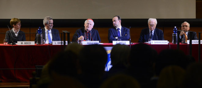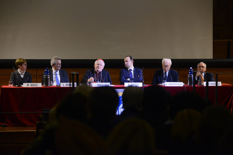 “Il Papa dei due millenni, dell’incarnazione, il Papa che ha mostrato il volto di Dio e il volto umano di Dio soprattutto ai giovani”. La presentazione del volume dell’allora segretario di Giovanni Paolo II e, oggi, suo successore come arcivescovo di Cracovia, il cardinale Stanislaw Dziwisz, è molto di più di un momento accademico o formale – seppure di intensa preparazione, a un mese esatto dalla Canonizzazione di Giovanni Paolo II e Giovanni XXIII –: è un dialogo che pare svilupparsi, presso l’Università Cattolica, tra il Pontefice futuro santo, i testimoni che lo conobbero da vicino, come il cardinale Scola e i moltissimi che affollano l’Aula Magna dell’Ateneo. «In questo libro, scritto con originalità, ho ritrovato la freschezza, la capacità propositiva, il sorriso del Papa ed è tornata con forza nel mio cuore la sua tensione piena alla santità», dice subito l’Arcivescovo.