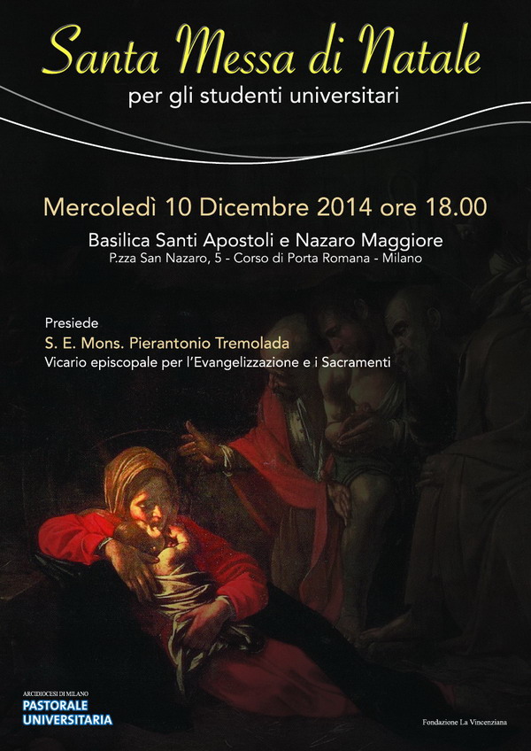 Per gli universitari di Milano una Messa per prepararsi a vivere il mistero del Natale. Si terrà mercoledì 10 dicembre, alle 18, presso la Basilica dei Santi Apostoli e Nazaro Maggiore (piazza San Nazaro 5, corso di Porta Romana a Milano), presieduta da monsignor Pierantonio Tremolada, vescovo ausiliare e vicario episcopale per l’evangelizzazione e i sacramenti. Oltre gli studenti, sono invitati anche i docenti e il personale tecnico-amministrativo.