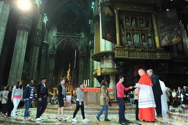 In silenzio e con grande attenzione i giovani hanno ascoltato le parole dell’Arcivescovo, fratello maggiore nella fede, che poco dopo ha consegnato il Credo a una rappresentanza di ragazzi e a un gruppo di catecumeni (in tutto oggi in Diocesi ce ne sono 150) dicendo: «Ricevete le parole della fede con cui rinascerete a nuova vita in Dio. Sono poche parole, ma contengono grandi misteri. Accoglietele e conservatele con cuore sincero». Un gesto semplice, ma carico di significato, con l’invito a diventare testimoni della Parola ricevuta. E prima di lasciare il Duomo l’Arcivescovo ha ricordato ai ragazzi che «tutti cercano Dio, ma hanno bisogno che qualcuno lo documenti».