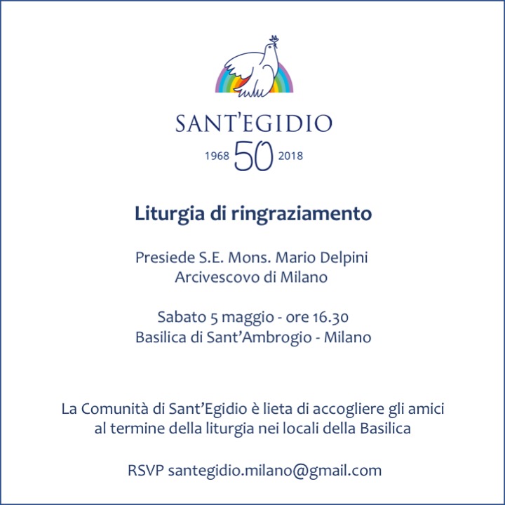 Compie mezzo secolo la Comunità di Sant’Egidio, fondata a Roma da Andrea Riccardi e da alcuni amici. A Milano si festeggia sabato 5 maggio, con una Messa alle 16.30 nella Basilica di Sant’Ambrogio, presieduta dall’arcivescovo Mario Delpini. «Sarà una liturgia di ringraziamento per i tanti doni ricevuti, da capire e da interpretare per il futuro», spiega Ulderico Maggi, referente a Milano della Comunità che nel tempo ha camminato accanto a bambini, anziani, senzatetto, stranieri.