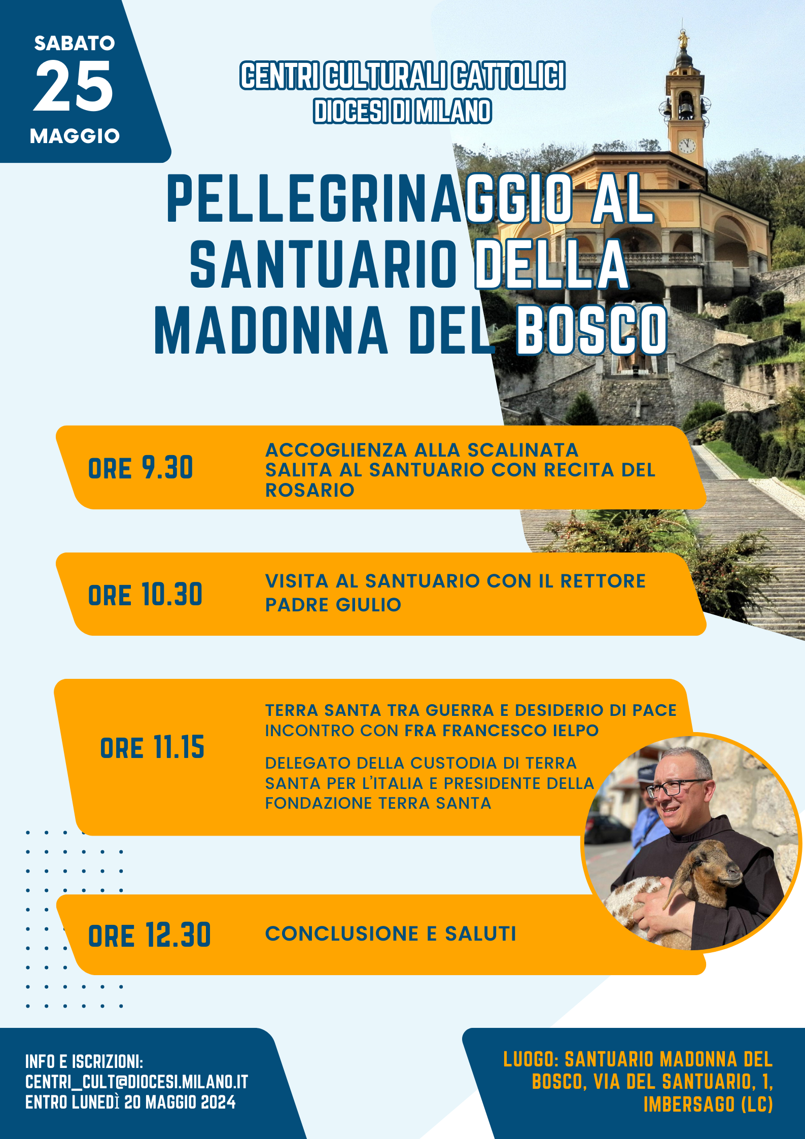 Sono dunque aperte le iscrizioni per il pellegrinaggio al Santuario della Madonna del Bosco a Imbersago (Lc), previsto per la mattina di sabato 25 maggio. Un invito rivolto a tutti i Centri culturali cattolici della Diocesi, l’occasione giusta per raccogliersi insieme in un momento di preghiera, ascolto e condivisione nella splendida cornice della Valle dell’Adda (vedi qui la locandina).