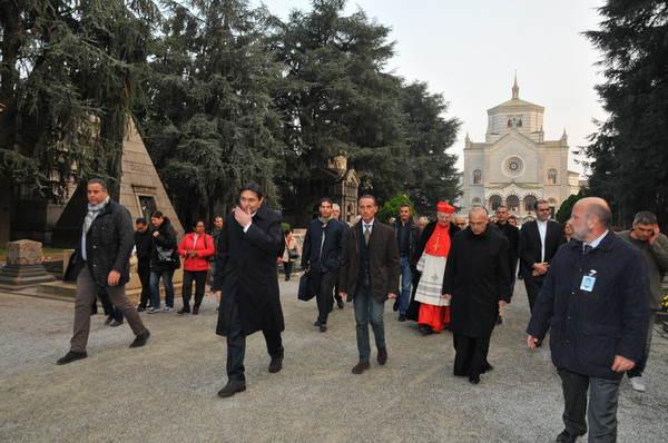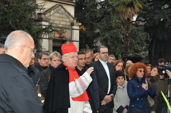 Presiede la celebrazione eucaristica in quella che definisce «chiesa a cielo aperto», sul piazzale gremito del Cimitero Monumentale di Milano. È l’ora dei primi vesperi della giornata che la Chiesa dedica alla commemorazione dei defunti, con una luce che scende calda, illuminando i colori autunnali di fiori e alberi, delle pietre e dei marmi. Tante persone si fermano, ascoltano la parola del cardinale Scola. Iniziata da pochissimo la Messa, già non bastano le sedie: la gente si affolla anche dalle scale che portano ai corridoi storici superiori, occupa tutte le panche della vicina cappella e, anche se non vede, segue attenta.