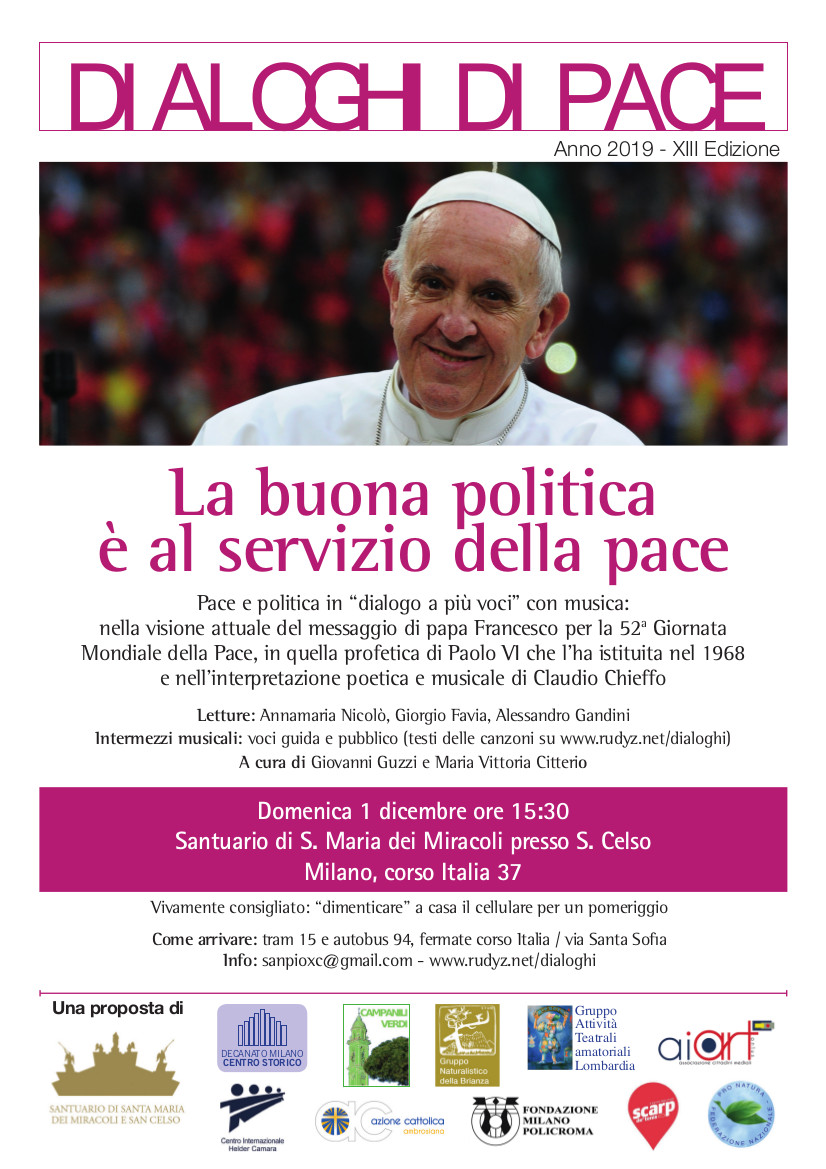 «La buona politica è al servizio della pace», tema del Messaggio di papa Francesco per la Giornata mondiale della Pace 2019, si presta per un’edizione speciale dei Dialoghi di Pace con canzoni di Claudio Chieffo dal testo attinente. La riflessione sulla pace si basa quindi sulla visione profetica di Paolo VI, sul pensiero attuale di papa Francesco e sull’interpretazione poetica e musicale di Chieffo.