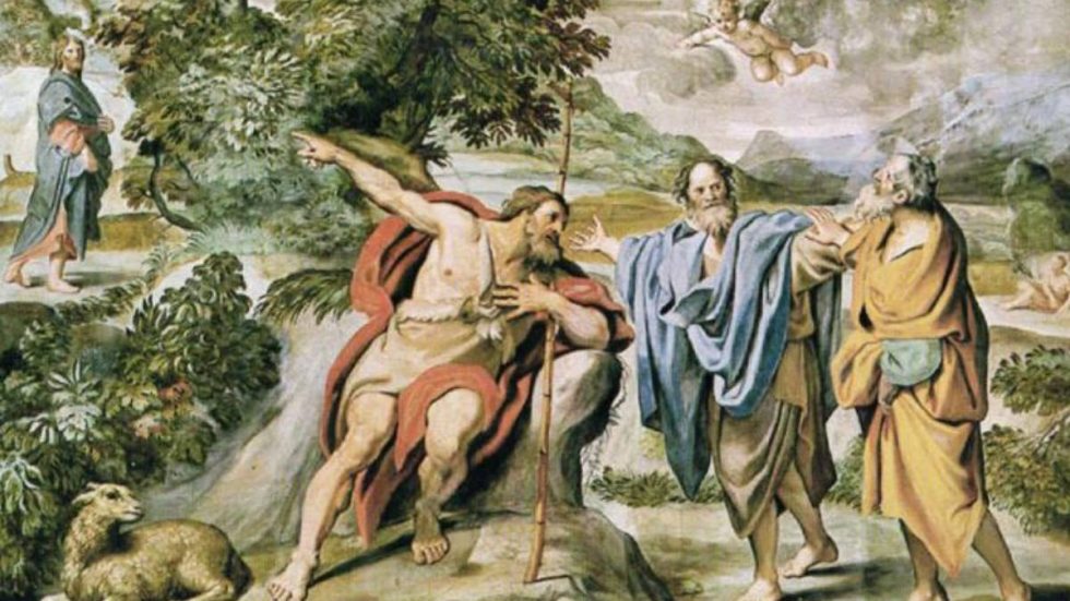 Nel vivace affresco riportato in alto, realizzato da Domenichino quattro secoli fa nell'abside della chiesa di Sant'Andrea della Valle a Roma (per il Giubileo del 1625), in uno stile che unisce il classicismo michelangiolesco alle novità caravaggesche (i gesti, in particolare, sembrano ripresi dai capolavori del Merisi), si ritiene che sia rappresentato il momento in cui il Battista indica a due suoi discepoli «l'Agnello di Dio», invitandoli quindi a seguire il Messia, secondo il racconto di Giovanni (1, 35-37). La concitazione della scena, tuttavia, sembra evocare proprio il brano del Vangelo odierno di Luca (7, 18-19).