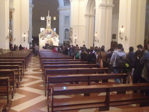 Dalla Porziuncola i vari gruppi si sono messi in cammino alla scoperta di Assisi e delle tracce che San Francesco ha lasciato in modo indelebile nella sua città. I ragazzi hanno potuto riconoscere i luoghi che hanno in un certo senso hanno «frequentato» nel percorso di avvicinamento al Pellegrinaggio dal titolo «Un biglietto per Assisi», elaborato dal Servizio per i ragazzi, gli adolescenti e l’oratorio per il cammino dei preadolescenti nei tempi di Quaresima e di Pasqua. A ogni luogo è stato associato un tema che si riferisce alla vita cristiana, incarnata nell’esperienza quotidiana dei ragazzi. È così, per esempio, che l’Eremo delle carceri ha richiamato la dimensione della preghiera quotidiana dei ragazzi, la chiesa di San Damiano la scelta vocazionale di ciascuno, la Porziuncola proprio l’immagine della «perfetta letizia» e quindi della gioia e la Basilica di San Francesco, che contiene le reliquie del Santo, il riferimento alla morte e alla risurrezione. I ragazzi hanno potuto così comprendere il significato di questo viaggio nella ricerca del Signore Gesù come maestro della propria vita, così come ha sottolineato monsignor Paolo Martinelli descrivendo le scelte del Poverello di Assisi: «Francesco ha scoperto che c’è una morte che dà la vita, che è quella di Gesù sulla croce, e c’è un amore più forte della morte. Per Francesco essere povero, umile e piccolo significa imitare Gesù che ha dato la vita per amore». I ragazzi hanno potuto così vivere l’esemplarità di un Santo sperimentando anche le fatiche di un viaggio, dell’essere per un po’ distanti dai genitori e imparare a stare in gruppo in modo continuativo vivendo un’esperienza formativa insieme agli altri.