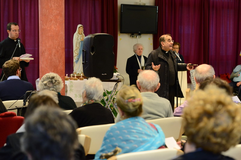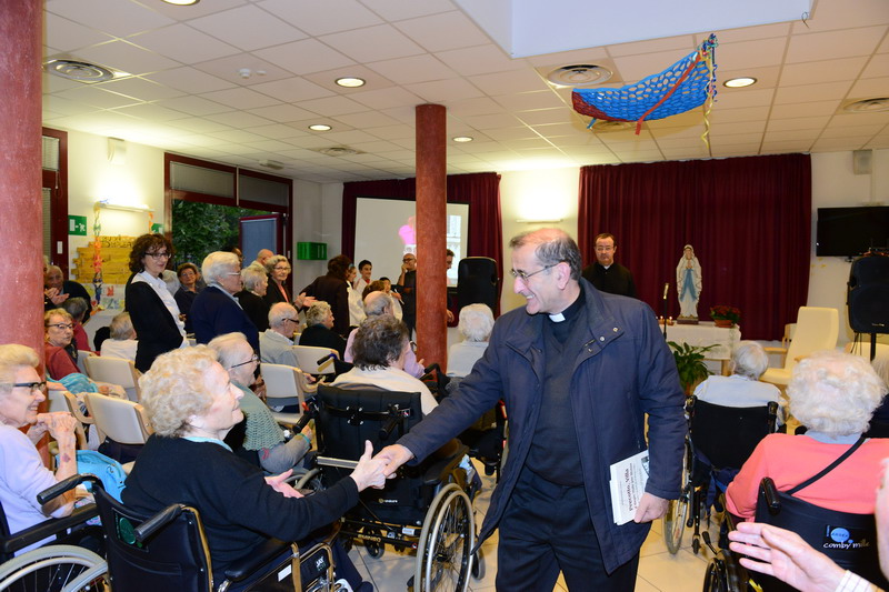 Dopo la recita della prima decina dei Misteri della Luce, “Il Battesimo di Gesù”, l’Arcivescovo dice agli anziani riuniti nella semplice Cappella dell’Istituto: «Questa non è una chiesa storica, ma è una Chiesa fatta da voi, dal bene che avete realizzato, dalla bellezza delle vostre vite. Vi lascio la mia immaginetta come segno di amicizia, impegnandoci a pregare gli uni per gli altri. La Pietà Rondanini (l’ultima scolpita da Michelangelo, intorno ai 90 anni), pone le figure del Cristo morto e della Madre in una posizione tale da ricavare il messaggio che la Madonna stia in piedi perché si appoggia al Figlio. Questa mi pare l’espressione profonda della nostra fede: Infatti ho scritto: “A questa morte si appoggia chi vive”. Una fede che mi fa coraggio e che vorrei condividere con voi, sapendo che, nelle difficoltà, non ci affidiamo solo alle nostre energie, ma a Gesù».