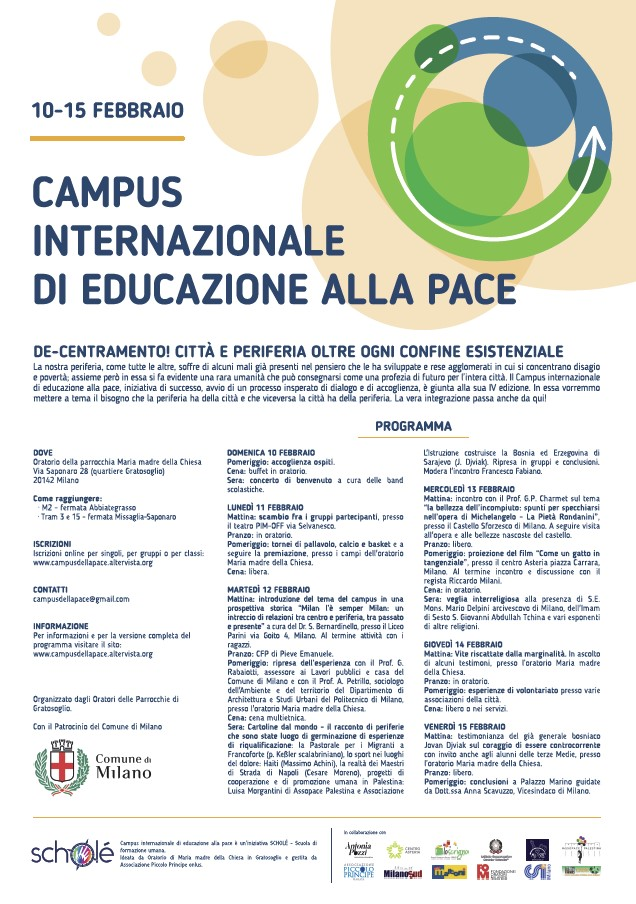 «“De-centramento” – Centro e periferia, oltre ogni confine esistenziale»: questo è il tema su cui, dal 10 al 15 febbraio, rifletteranno i partecipanti al Campus internazionale di Educazione alla Pace. L’iniziativa, giunta alla quarta edizione, parte dal quartiere di Gratosoglio, nella periferia sud di Milano, per raggiungere luoghi significativi del centro città e coinvolgere autorità e cittadini.